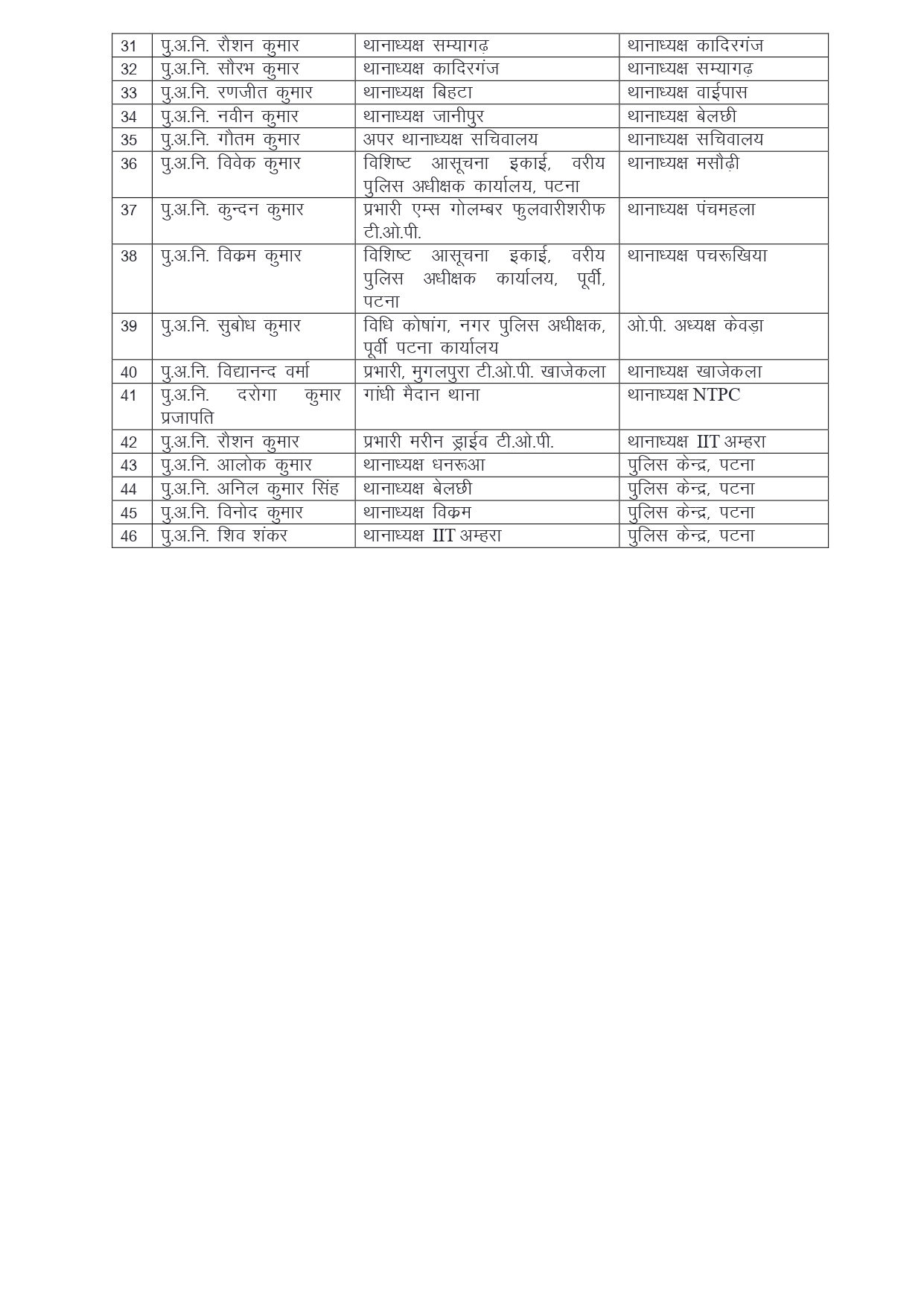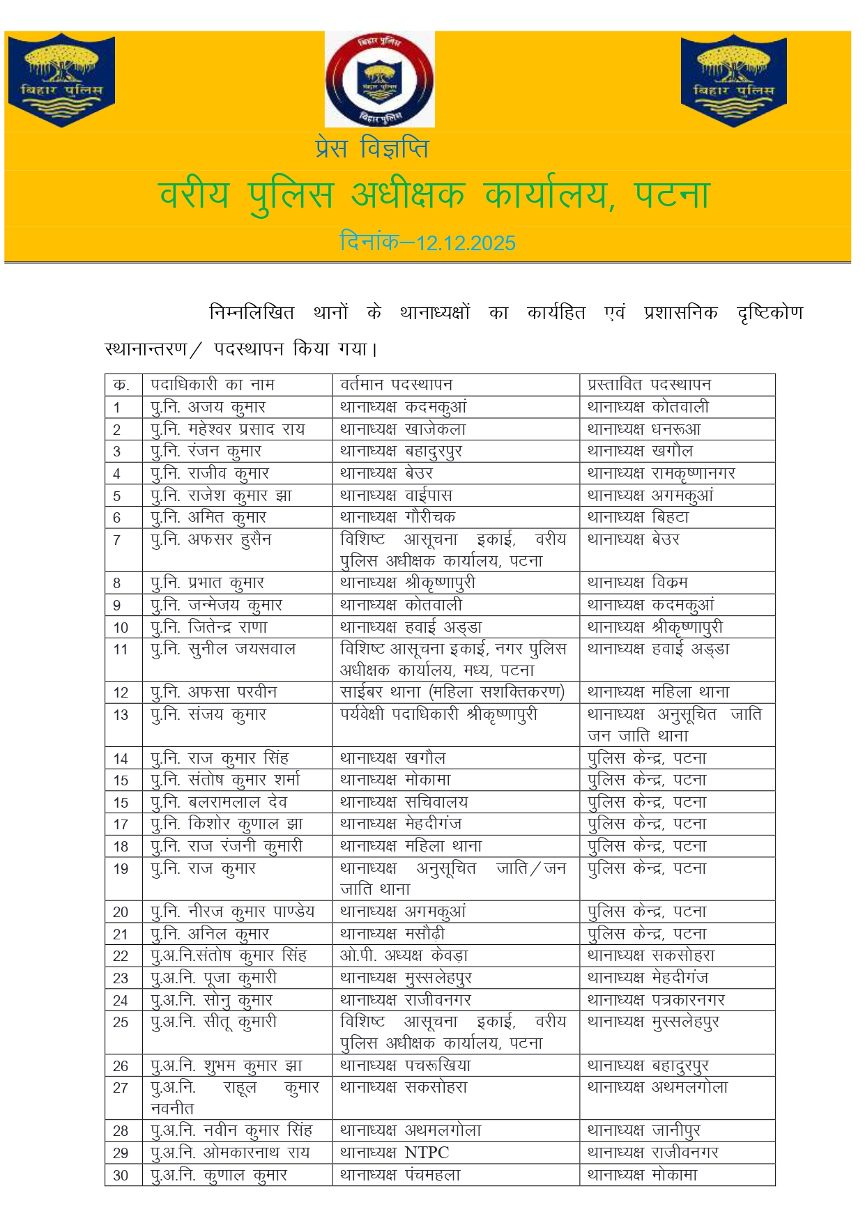 कदमकुआं, खाजेकला, बहादुरपुर, बेऊर, बाईपास, गौरीचक, कृष्णापुरी, कोतवाली, हवाई अड्डा, साइबर थाना, खगौल, मोकामा, सचिवालय, मेहदीगंज, महिला थाना,अगमकुआं, मसौढ़ी, केवड़ा, राजीवनगर, पचरूखिया, सकसोहरा, अथमलगोला, एनटीपीसी, पंचमहला,सम्यागढ़, कादिरगंज, बिहटा, जानीपुर, सचिवालय, गांधी मैदान, धनरुआ, बेलछी, विक्रम, आईआईटी अम्हरा सहित कई थानों के थानाध्यक्ष बदल दिये गये हैं। पूरी लिस्ट देखिये..