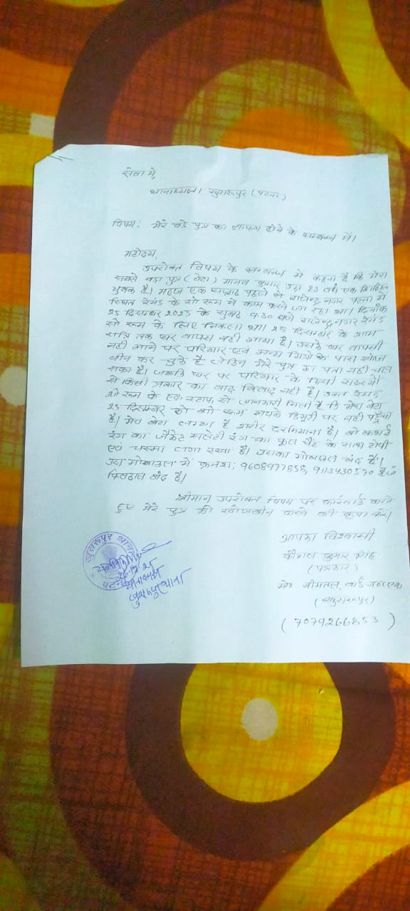 PATNA: राजधानी पटना से 23 साल का युवक अचानक लापता हो गया है। परिजनों ने उसकी काफी खोजबीन की लेकिन उसका कोई अता-पता नहीं चल सका। थक हारकर लापता युवक के पिता ने पटना के खुशरूपुर थाने में बेटे की गुमशुदगी की रिपोर्ट दर्ज कराई है और पुलिस से बेटे की सकुशल वापसी की मांग की है। जवान बेटे के अचानक गायब होने से परिजन काफी सदमें में हैं और इस कपकपाती ठंड और शीतलहर में दिन-रात उसे ढूंढने में लगे हैं। लापता होने के बाद से युवक का मोबाइल लगातार ऑफ है। मोबाइल बंद होने की वजह से परिजनों की चिंता और बढ़ गयी है।