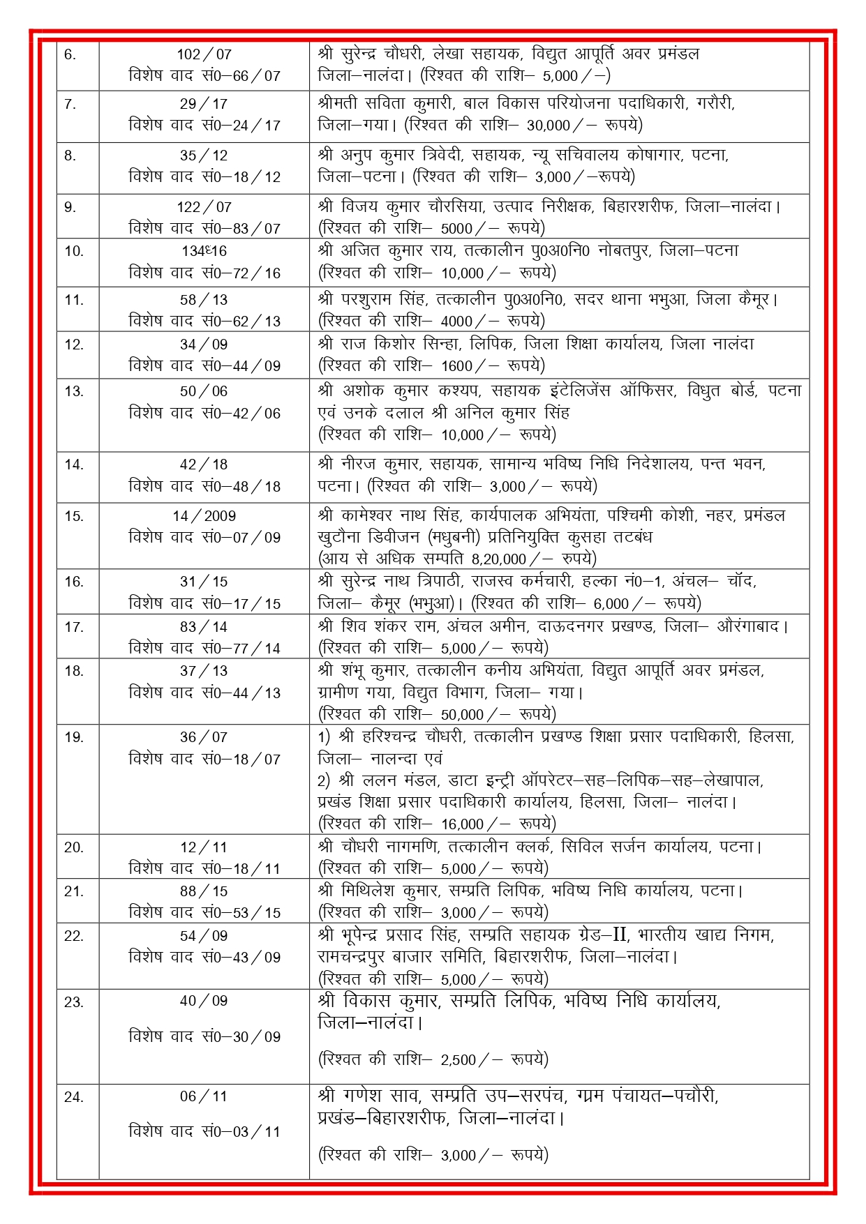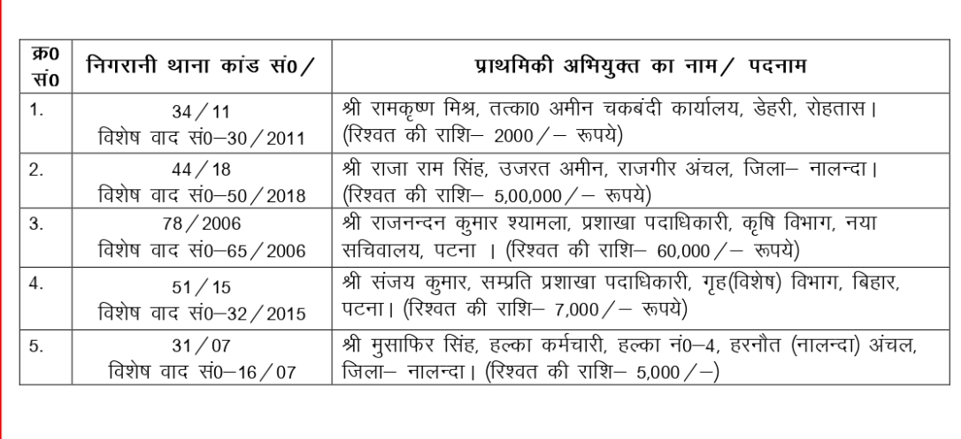 1. श्री सुरेश प्रसाद सिंह, सम्प्रति कार्यपालक अभियंता, पश्चिम पथ प्रमंडल, पथ निर्माण विभाग, जिला-पटना को भ्रष्टाचार निवारण अधिनियम की धारा-7 (a) में 04 वर्ष सश्रम कारावास एवं 5,00,000/- (पाँच लाख) रूपये का अर्थदण्ड लगाया गया है एवं