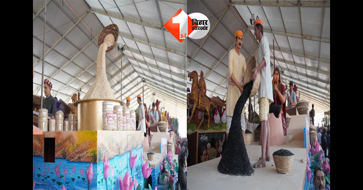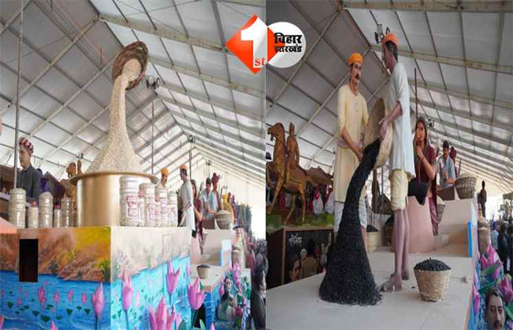 झांकी की दृश्य संरचना में झांकी दो भागों में मखाना की पूरी यात्रा को दर्शाती हैI कमल के पत्तों के बीच उभरा सफेद “लावा मखाना”, आगे GI टैग का प्रतीक और किनारों पर मिथिला पेंटिंग की बॉर्डर। दूसरे खंड में मखाना की कटाई, बीज संग्रह, ग्रेडिंग, भुनाई, फोड़ाई, पैकिंग और क्वालिटी चेक की पूरी प्रक्रिया। एक ओर मिट्टी के चूल्हे पर लोहे की कढ़ाही में मखाना भूनती महिला, दूसरी ओर लकड़ी के मूसल से फोड़ता पुरुष—यह दृश्य पारंपरिक श्रम, महिला सहभागिता और स्थानीय कौशल को जीवंत रूप में प्रस्तुत करता है। यह झांकी यह संदेश देती है कि मखाना केवल एक कृषि उत्पाद नहीं, बल्कि यह विरासत, श्रम, महिला भागीदारी और उद्यमिता का संगम है, जो बिहार को सीधे वैश्विक बाजारों से जोड़ता है।