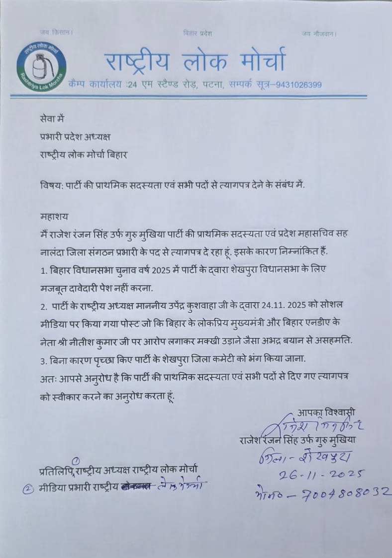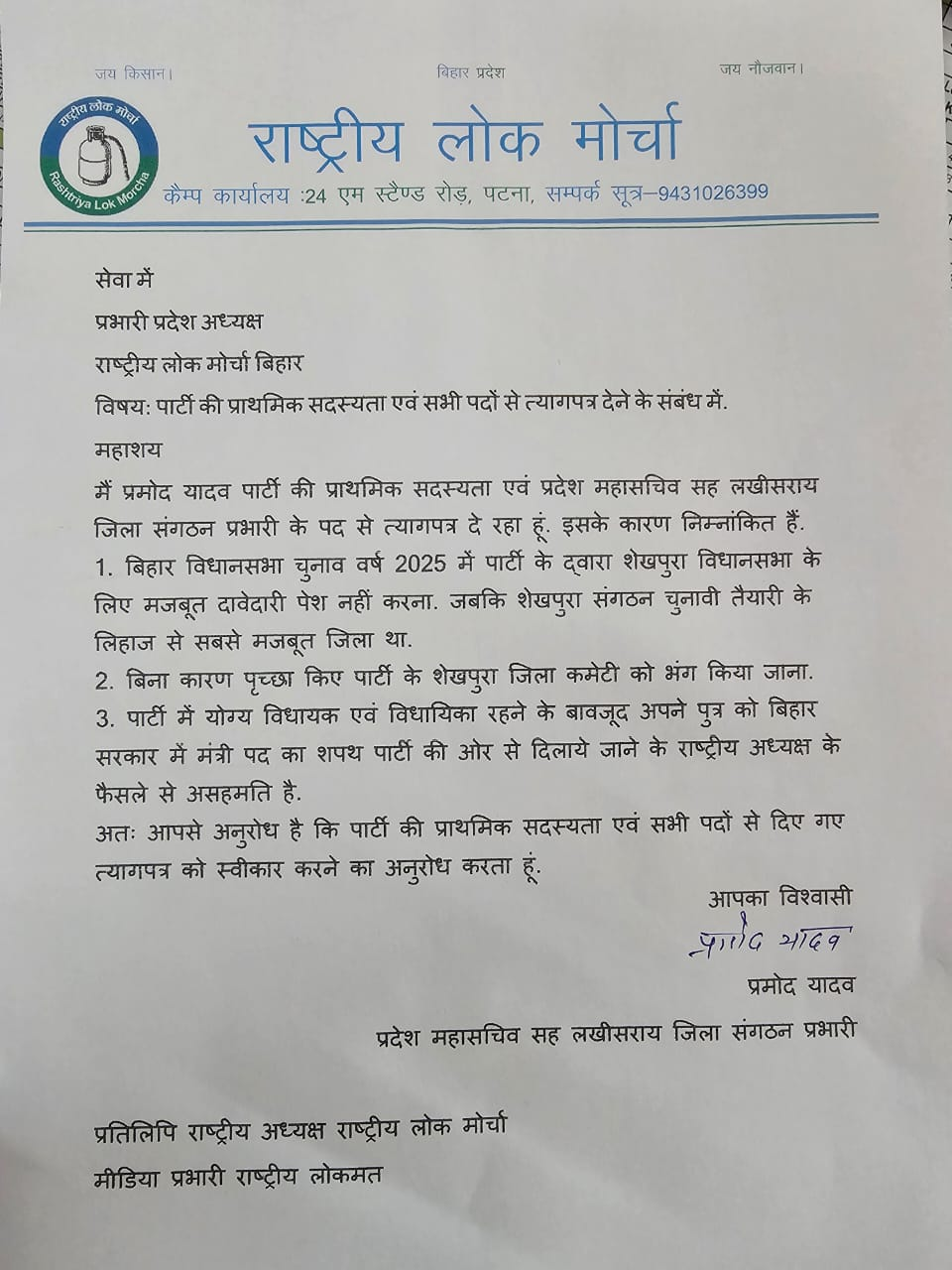 RLM के राष्ट्रीय अध्यक्ष उपेंद्र कुशवाहा को पत्र भेजकर यह कहा गया है कि पिछले दिनों पार्टी द्वारा लिए गए फैसलों से वे सहमत नहीं हैं। पार्टी के राष्ट्रीय उपाध्यक्ष जितेंद्र नाथ ने कहा कि 9 साल से वो उपेन्द्र कुशवाहा के साथ काम कर रहे हैं। लेकिन अब कई पार्टी के फैसले से खुद को जोड़ नहीं पा रहे हैं। ऐसी स्थिति में अब उपेन्द्र कुशवाहा के साथ काम करना संभव नहीं है। इसलिए हम अपने पद और पार्टी से इस्तीफा देना ही उचित समझ रहे है।