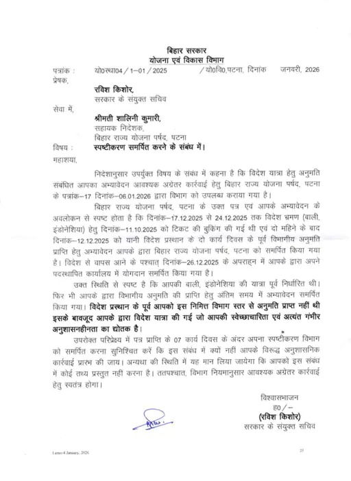 नोटिस में कहा गया है कि शालिनी कुमारी ने 17 दिसंबर से 24 दिसंबर 2025 तक बाली, इंडोनेशिया की यात्रा के लिए 11 अक्टूबर 2025 को टिकट बुक किया था। इसके दो महीने बाद 12 दिसंबर 2025 को, यानी विदेश प्रस्थान के दो कार्य दिवस पहले, उन्होंने विभाग से अनुमति के लिए आवेदन किया। विदेश से लौटने के बाद 26 दिसंबर 2025 को उन्होंने अपने पदस्थ कार्यालय में ज्वाइन किया।