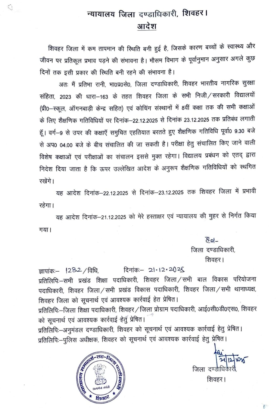SHEOHAR: शिवहर में पिछले एक सप्ताह से लगातार ठंड का कहर जारी है। कपकपाती ठंड को लेकर सभी सरकारी और निजी विद्यालय को 23 दिसंबर तक बंद रखने का फैसला डीएम प्रतिभा रानी ने लिया है। उन्होंने आदेश जारी करते हुए कहा कि शिवहर में गिरते तापमान और बच्चो के स्वास्थ्य पर पड़ते असर को देखते हुए जिला के सभी सरकारी व निजी विद्यालय 23 दिसम्बर तक बन्द कर दिया गया है. वही शिक्षक प्रतिदिन विद्यालय जाएंगे. यह विद्यालय एक से 8वीं कक्षा तक के लिए बन्द किया गया है। बिहार में कड़ाके की ठंड और गिरते तापमान को देखते हुए अररिया, सिवान, भोजपुर, गोपालगंज और सीतामढ़ी में 24 दिसंबर तक सभी स्कूल बंद रखने का आदेश जारी किया गया है। वहीं मुजफ्फरपुर में स्कूलों के समय में बदलाव किया गया है।