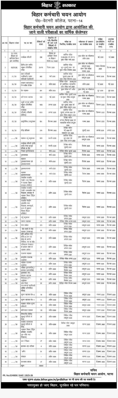BSSC recruitment 2026 : बिहार कर्मचारी चयन आयोग (BSSC) ने वर्ष 2026 के लिए 45 विभिन्न भर्ती परीक्षाओं का वार्षिक कैलेंडर जारी कर दिया है। इस कैलेंडर में विज्ञापन से लेकर प्रारंभिक परीक्षा, मुख्य परीक्षा और रिजल्ट तक की संभावित समयसीमा बताई गई है। सबसे बड़ी भर्ती, सेकेंड इंटर लेवल भर्ती 2026 के तहत 26,000 पदों के लिए प्रारंभिक परीक्षा जून-जुलाई 2026 में और मुख्य परीक्षा सितंबर 2026 में होगी। मुख्य परीक्षा का रिजल्ट अक्टूबर में जारी होगा और टाइपिंग परीक्षा नवंबर 2026 में संपन्न होगी। नियुक्ति की अनुशंसा वर्ष 2026 में की जाएगी। इस भर्ती में 33 लाख से अधिक उम्मीदवारों ने आवेदन किया था।