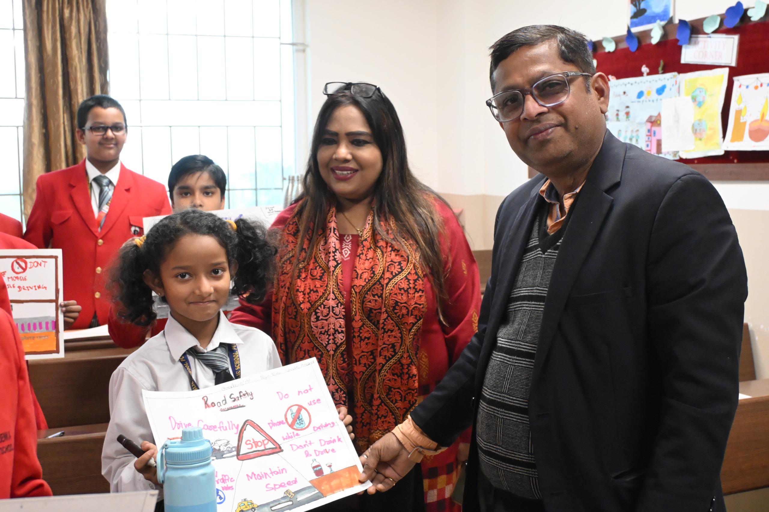 दिनांक 22 जनवरी 2026 को कक्षा 3 से 5 के विद्यार्थियों के लिए चित्रकला प्रतियोगिता आयोजित की गई, जिसमें बच्चों ने रंगों एवं रचनात्मकता के माध्यम से सड़क सुरक्षा की भावना को अत्यंत सुंदर एवं प्रभावपूर्ण रूप में प्रस्तुत किया। चित्रों में ट्रैफिक सिग्नल, ज़ेब्रा क्रॉसिंग, हेलमेट, सीट बेल्ट, गति सीमा तथा सावधानीपूर्वक सड़क पार करने जैसे विषयों को दर्शाकर विद्यार्थियों ने यह प्रमाणित किया कि वे सुरक्षा के महत्व को गहराई से समझते हैं।