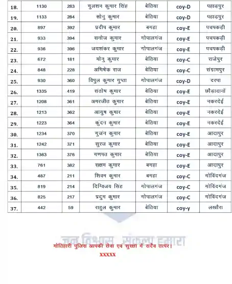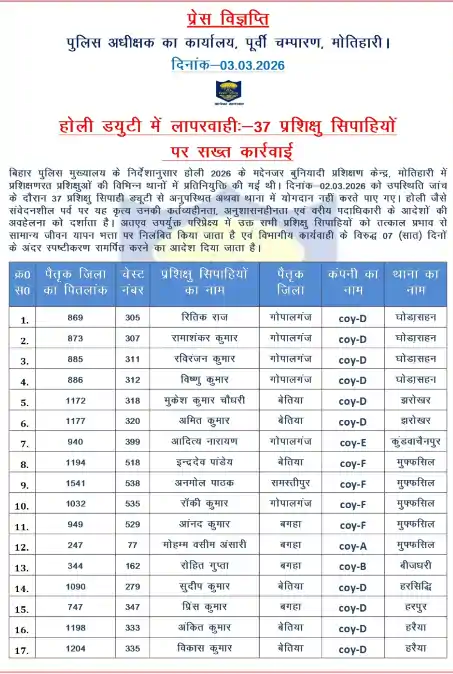 BIHAR:पुलिस महकमे से जुड़ी बड़ी खबर पूर्वी चंपारण से आ रही है, जहां होली में ड्यूटी से गायब रहने वाले 37 सिपाहियों को सस्पेंड कर दिया गया है। एसपी स्वर्ण प्रभात ने बिना पूर्व सूचना ड्यूटी से गायब रहने वाले कॉन्स्टेबलों को तत्काल प्रभाव से निलंबित कर दिया है।