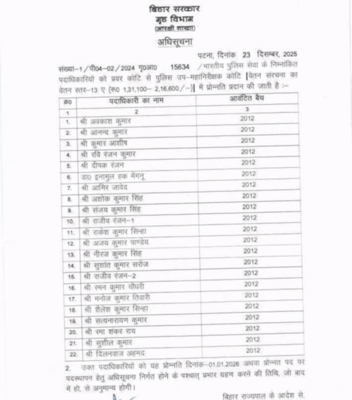 गृह विभाग की जारी अधिसूचना के अनुसार बिहार सरकार ने भारतीय पुलिस सेवा के 22 आईपीएस अधिकारियों का प्रमोशन कर दिया है। ये सभी 2012 बैच के आईपीएस अधिकारी हैं। सरकार ने इन्हें प्रमोशन देते हुए डीआईजी बना दिया है। बिहार सरकार ने 2012 बैच के आईपीएस अधिकारी अवकाश कुमार, आनंद कुमार, कुमार आशीष, रवि रंजन कुमार, दीपक रंजन, इमामुल हक मेंगनू, आमिर जावेद, अशोक कुमार सिंह, संजय कुमार सिंह, राजीव रंजन-1, राकेश कुमार सिन्हा, अजय कुमार पांडेय, नीरज कुमार सिंह, सुशांत कुमार सरोज, राजीव रंजन-2, रमन कुमार चौधरी, मनोज कुमार तिवारी, शैलेश कुमार सिन्हा, सत्यनारायण कुमार, रमा शंकर राय, सुशील कुमार और दिलनवाज अहमद को डीआईजी में प्रमोशन दे दिया है।