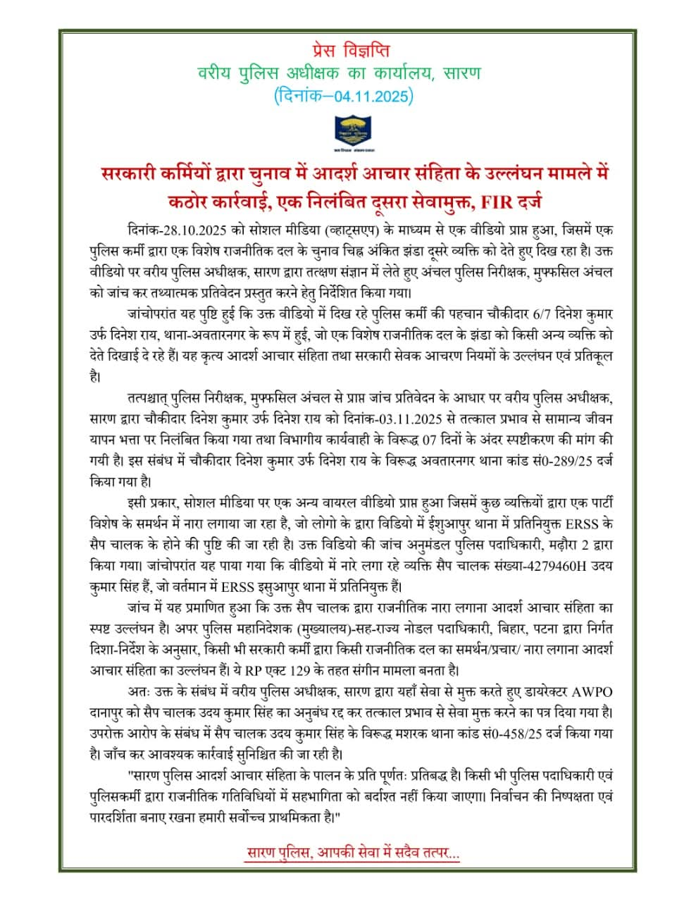 “सारण पुलिस आदर्श आचार संहिता के पालन के प्रति पूर्णतः प्रतिबद्ध है। किसी भी पुलिस पदाधिकारी या कर्मी द्वारा राजनीतिक गतिविधियों में भागीदारी को किसी भी परिस्थिति में बर्दाश्त नहीं किया जाएगा। निर्वाचन की निष्पक्षता एवं पारदर्शिता बनाए रखना हमारी सर्वोच्च प्राथमिकता है।” वरीय पुलिस अधीक्षक, सारण