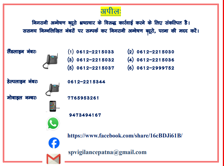 निगरानी अन्वेषण ब्यूरो, बिहार, पटना का वर्ष 2025 में भ्रष्टाचार के विरुद्ध यह 109वीं प्राथमिकी दर्ज करने की कार्रवाई है। जिसमें यह ट्रैप संबंधी 89वां कांड है, जिसमें कांड दर्ज कर अभी तक कुल 97 अभियुक्तों को रंगे हाथ गिरफ्तार किया जा चुका है तथा रिश्वत की कुल बरामद राशि 35,31,500/- (पैतीस लाख इक्कतीस हजार पाँच सौ) रूपये है।