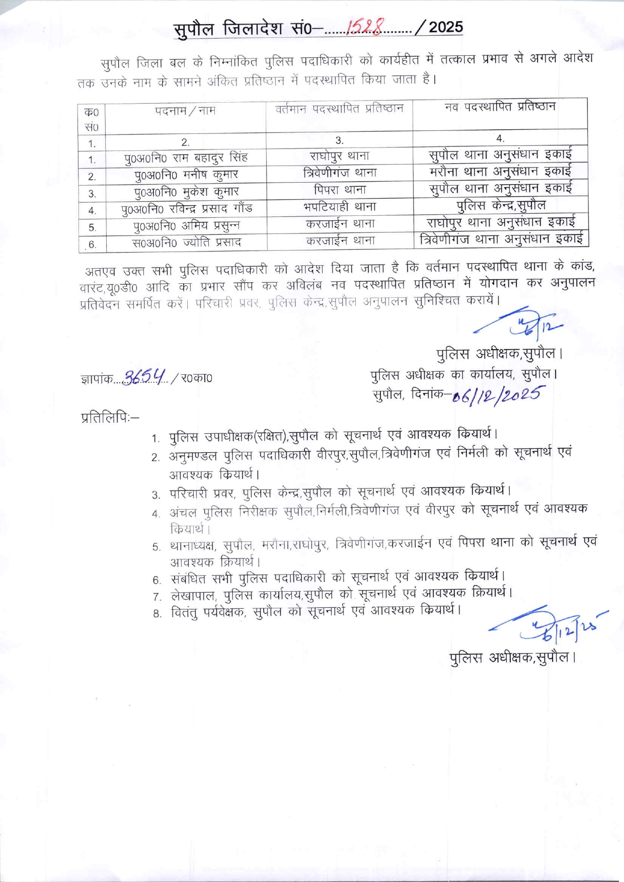 जारी तबादला सूची के अनुसार,राघोपुर थाना में पदस्थापित सब इंस्पेक्टर राम बहादुर सिंह को सुपौल थाना अनुसंधान इकाई में भेजा गया है। वहीं त्रिवेणीगंज थाना में कार्यरत सब इंस्पेक्टर मनीष कुमार को भी अनुसंधान इकाई सुपौल में पदस्थापित किया गया है। पिपरा थाना में तैनात मुकेश कुमार का भी स्थानांतरण सुपौल थाना अनुसंधान इकाई में हुआ है।इसके अतिरिक्त,भपटियाही थाना में पदस्थापित सब इंस्पेक्टर रविन्द्र प्रसाद गौंड को पुलिस केंद्र सुपौल भेजा गया है।
