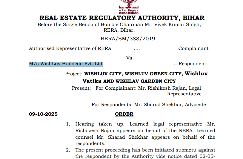 इसके साथ ही रेरा ने अपने कार्यालय को निर्देश दिया कि वह महानिरीक्षक निबंधन, बिहार को एक पत्र जारी करे कि वह पटना के सभी संबंधित जिला निबंधकों/उप-पंजीयकों को पत्र जारी करे कि प्रतिवादी कंपनी WishLuv Buildcon Pvt. Ltd और उसके निदेशकों द्वारा परियोजनाओं के लिए बिक्री विलेख के निष्पादन पर पूर्ण प्रतिबंध लगाया जाए, साथ ही कंपनी और उसके निदेशकों के विज्ञापन और विवरण की प्रति भी संलग्न की जाए.प्राधिकरण संबंधित अंचल के अंचल अधिकारी को निर्देश दिया है कि वह प्रतिवादी कंपनी और उसके निदेशकों द्वारा उक्त परियोजनाओं से संबंधित किसी भी भूमि का म्यूटेशन न करें।