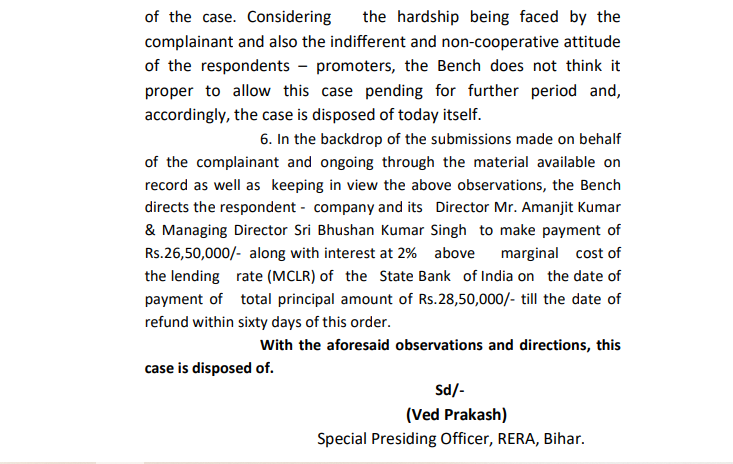 रेरा ने 13 फरवरी के आदेश में कहा है कि Patna Green Housing Pvt. Ltd. & Ors. के प्रोजेक्ट METRO VRINDAVAN CITY में पैसा लगाए Shubham Kumar को 26 लाख 50 हजार रू सूद के साथ वापस करे. इसी के साथ केस को डिस्पोज कर दिया गया.