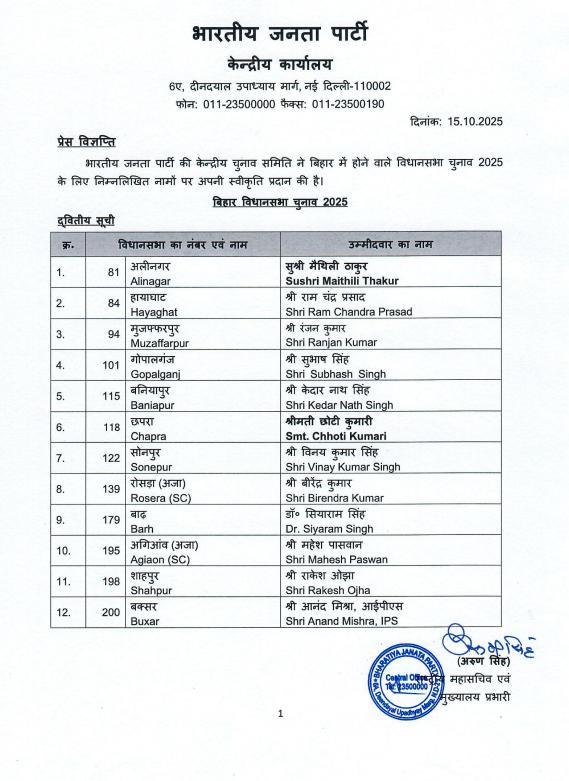 Bihar Assembly Election 2025 : बिहार विधानसभा चुनाव 2025 की सरगर्मी बढ़ती जा रही है और राजनीतिक दल अपनी रणनीतियों को अंतिम रूप देने में जुटे हैं। इसी कड़ी में आज भारतीय जनता पार्टी (भाजपा) ने दूसरे चरण के चुनाव के लिए अपनी उम्मीदवारों की दूसरी लिस्ट जारी की है। इस लिस्ट में कुल 12 नए उम्मीदवारों के नाम शामिल किए गए हैं, जिससे पार्टी के चुनावी पैनल में नई जान आ गई है।