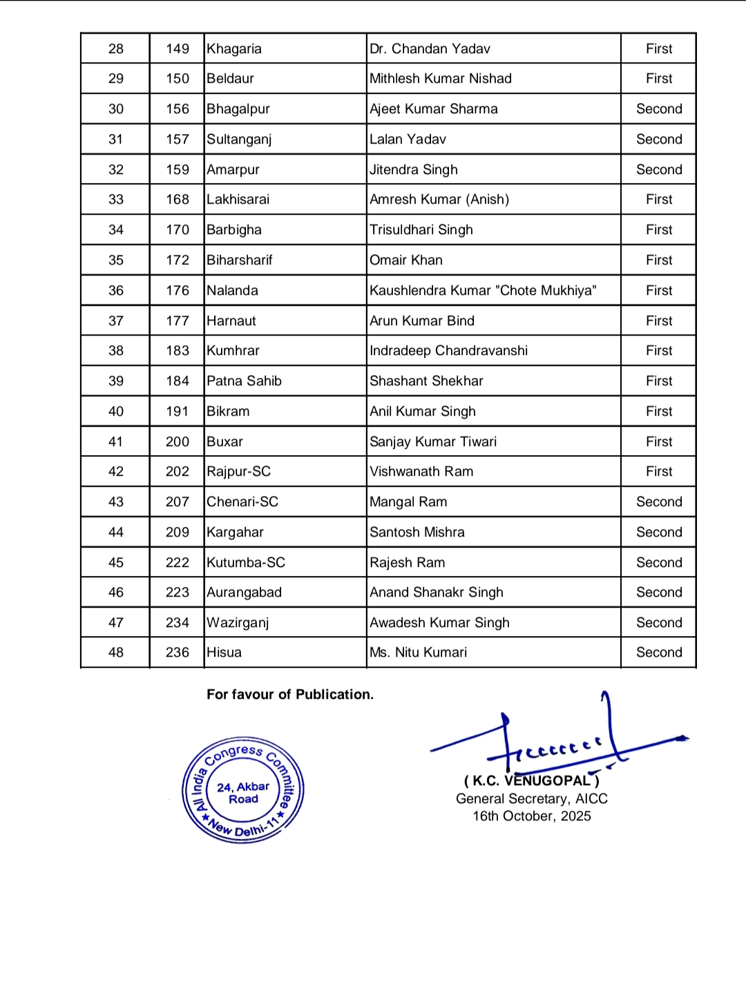 BIHAR ELECTION: बिहार में महागठबंधन के अंदर अभी भी सीट बंटवारे का पेंच सुलझाया नहीं जा सका है। लेकिन इस गठबंधन में एक पार्टी को छोड़ बाकी सभी पार्टी अपने कैंडिडेट को दनादन सिंबल देने का काम कर रही हैं। इसी कड़ी में अब बिहार कांग्रेस के तरफ से भी आज देर रात अपने कैंडिडेट के नाम की पहली लिस्ट जारी कर दी गई है।