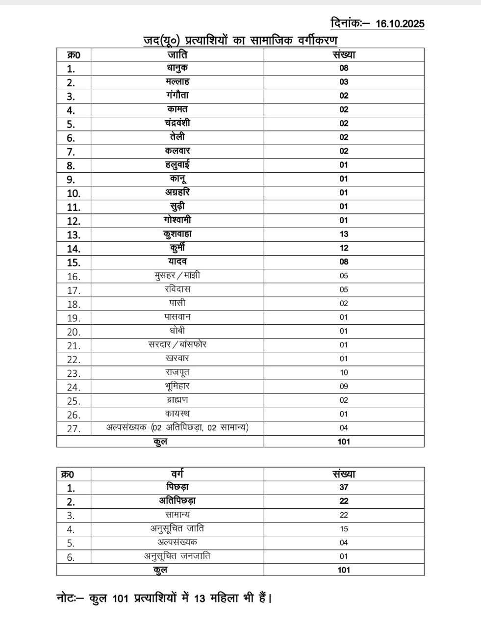 यह साफ दर्शाता है कि जेडीयू ने बिहार के जातीय और सामाजिक समीकरण को ध्यान में रखते हुए चुनावी तैयारियां पूरी कर ली हैं।