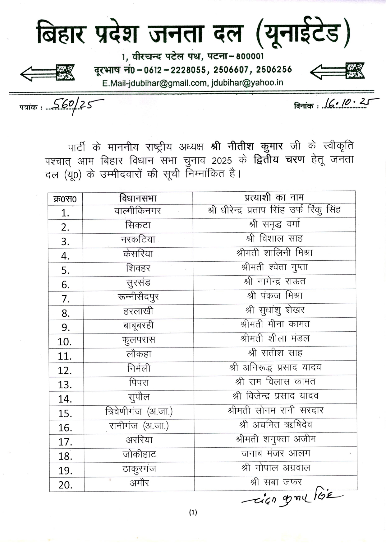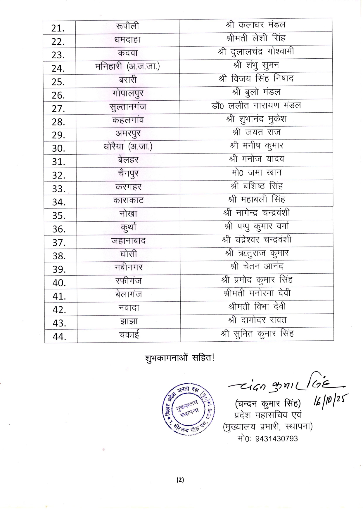 BIHAR ELECTION : बिहार विधानसभा चुनाव 2025 को लेकर जनता दल यूनाइटेड (JDU) ने अपनी दूसरी कैंडिडेट लिस्ट जारी कर दी है। इस सूची में कुल 44 उम्मीदवारों के नाम शामिल किए गए हैं, जो विभिन्न विधानसभा सीटों से चुनाव लड़ेंगे। पार्टी ने उम्मीदवारों के चयन में जातीय समीकरण, इलाके की राजनीति और अनुभव को ध्यान में रखा है।