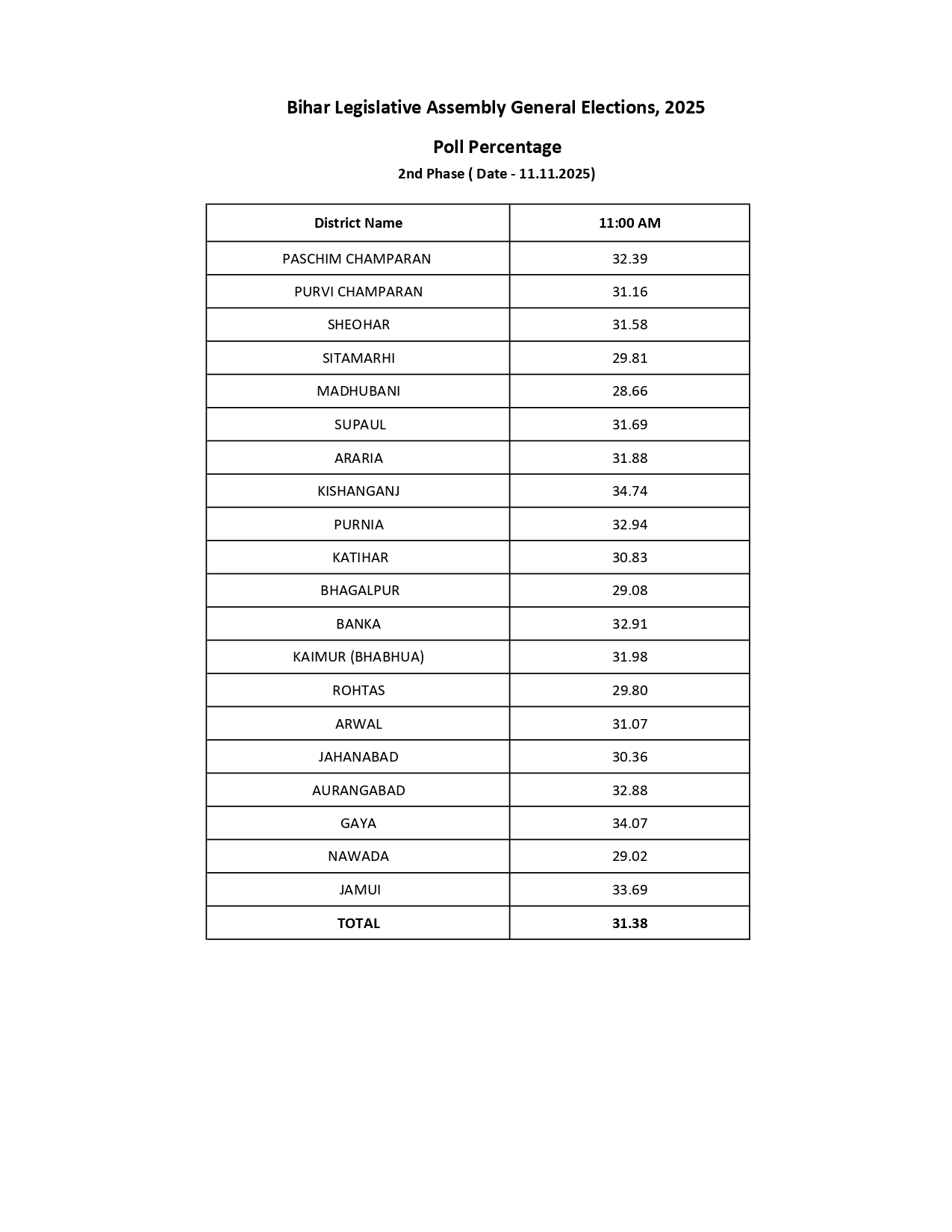 Bihar Election 2025: बिहार में विधानसभा चुनाव के लिए 11 नवंबर को दूसरे चरण की वोटिंग हो रही है। सुबह 7 बजे से ही मतदाता अपने मतदान केंद्रों पर कतारबद्ध होकर अपने मताधिकार का इस्तेमाल कर रहे हैं। इस बीच चुनाव आयोग ने वोटिंग परसेंट जारी किया है। चुनाव आयोग के मुताबिक, सुबह 11 बजे तक औसत 31.38 प्रतिशत वोटिंग हुई है।