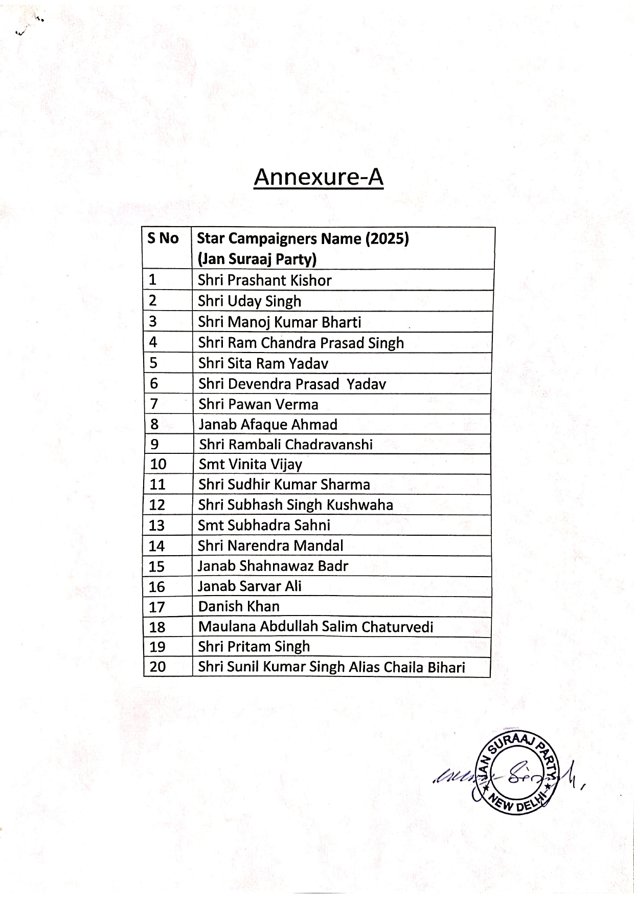 इस लिस्ट में 20 नेताओं के नाम हैं, जो सभी 234 उम्मीदवारों के लिए मतदाताओं से वोट की अपील करेंगे। जन सुराज पार्टी के स्टार प्रचारकों में प्रशांत किशोर का नाम सबसे पहले है। उसके बाद दूसरे नंबर पर पार्टी के राष्ट्रीय अध्यक्ष उदय सिंह का नाम है। इनके अलावा मनोज कुमार बिहारी, आरसीपी सिंह, सीताराम यादव और पवन वर्मा समेत अन्य नेताओं के नाम शामिल हैं।