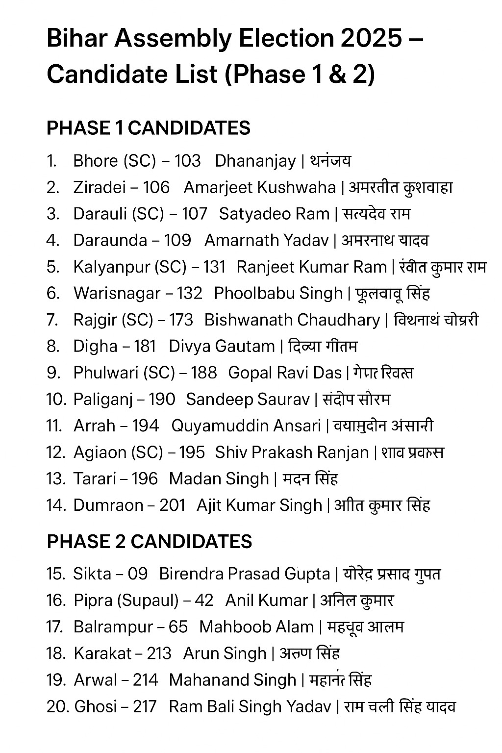 बिहार विधानसभा चुनाव के लिए महागठबंधन समर्थित भाकपा (माले) ने अपने सभी चरणों के लिए उम्मीदवारों की सूची जारी कर दी है। कुल 20 सीटों पर माले ने अपने प्रत्याशी उतारे हैं।