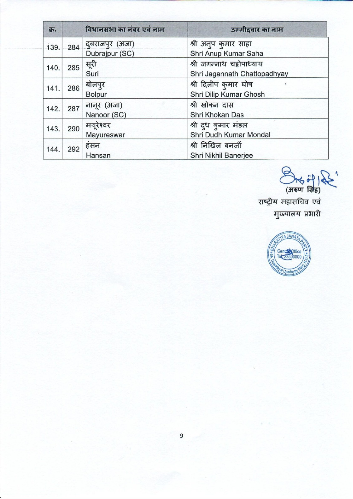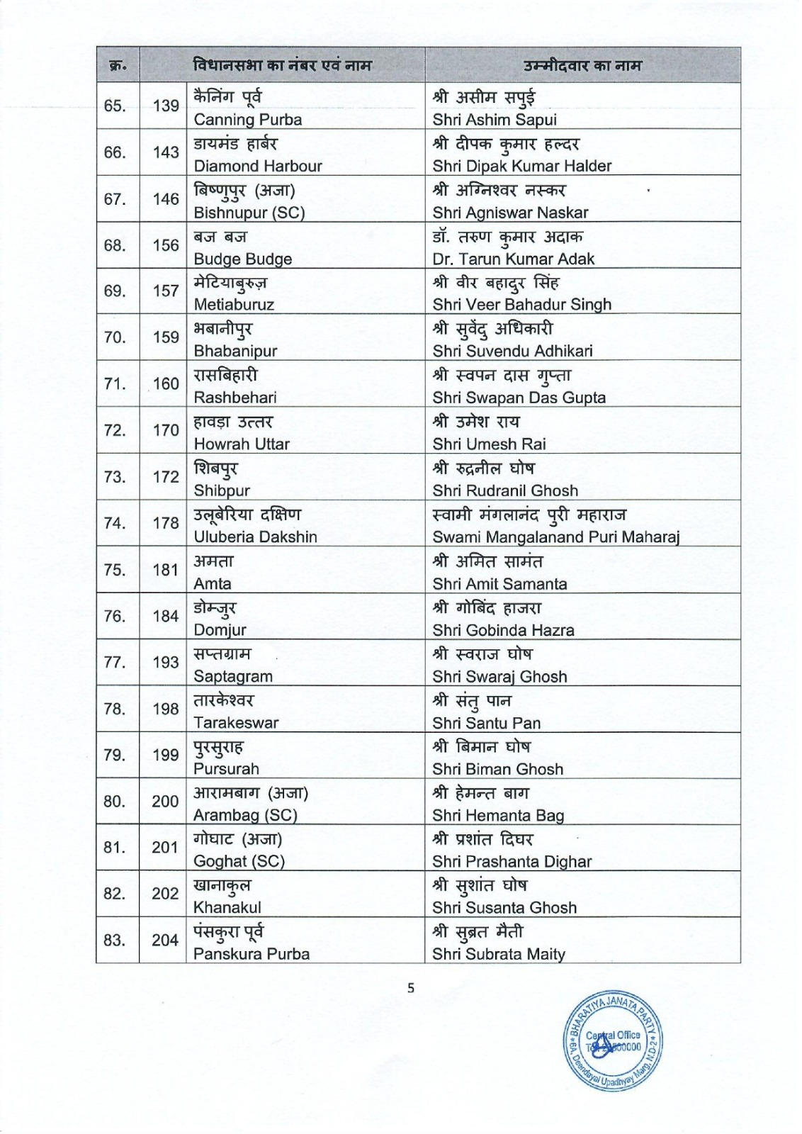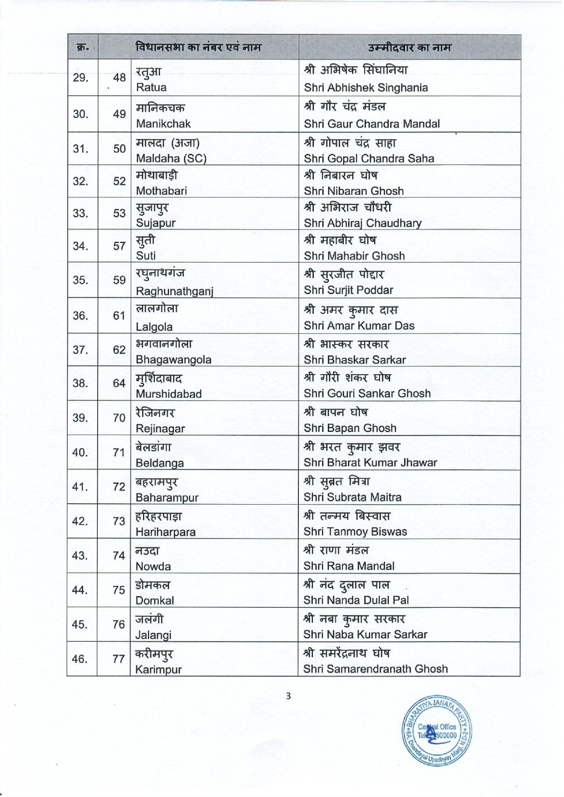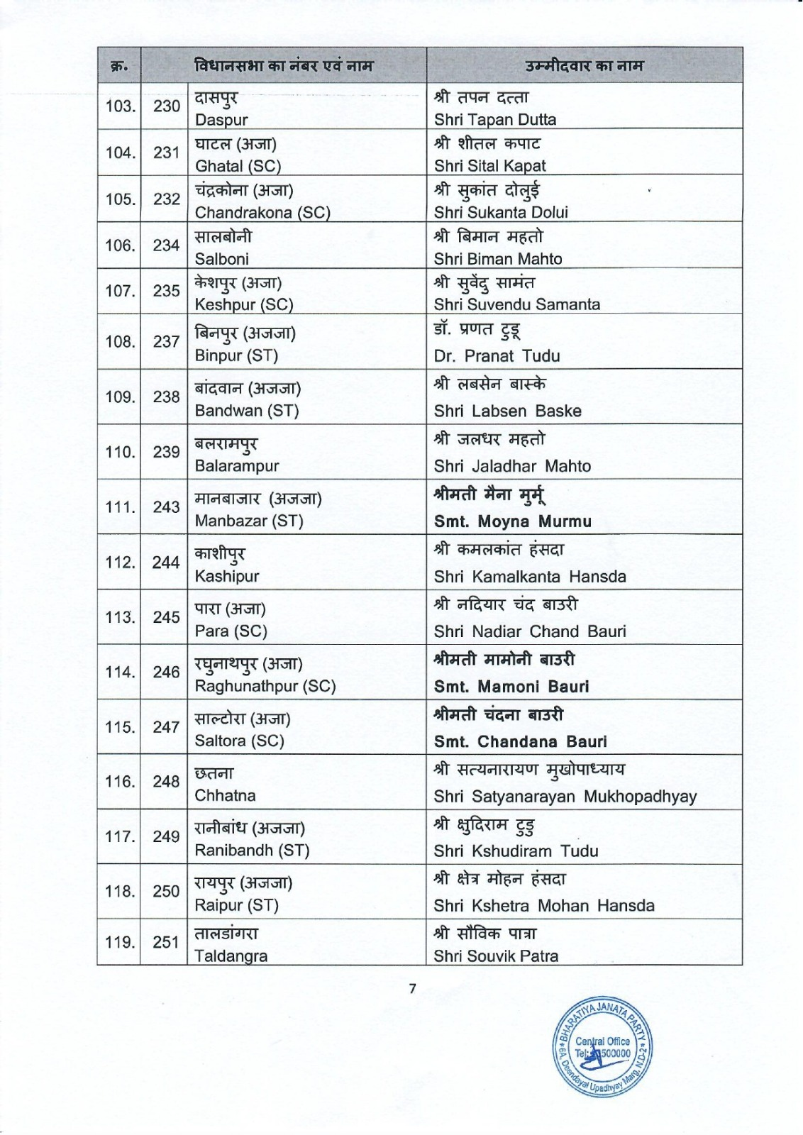 भाजपा ने लगभग आधी सीटों पर अपने प्रत्याशी घोषित कर दिए हैं। पार्टी ने नेता प्रतिपक्ष शुभेंदु अधिकारी को भवानीपुर विधानसभा सीट से उम्मीदवार बनाया है। वहीं भाजपा के पूर्व प्रदेश अध्यक्ष दिलीप घोष को खड़गपुर सदर सीट से चुनाव मैदान में उतारा गया है।