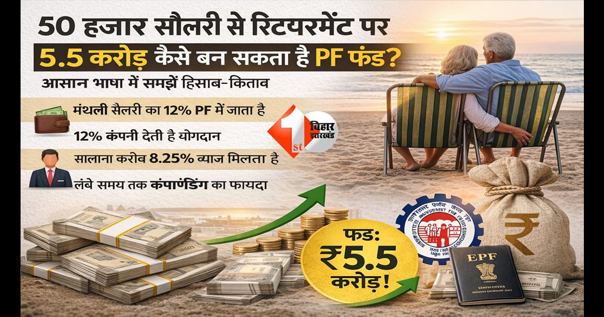 अगर 50 हजार रुपये की सैलरी से पीएफ में हर महीने योगदान होता रहे, हर साल सैलरी में बढ़ोतरी होती रहे और करीब 8.25 प्रतिशत का ब्याज मिलता रहे, तो रिटायरमेंट तक जमा रकम और उस पर मिलने वाला ब्याज मिलाकर कुल फंड करीब 5 से 5.5 करोड़ रुपये तक पहुंच सकता है।
