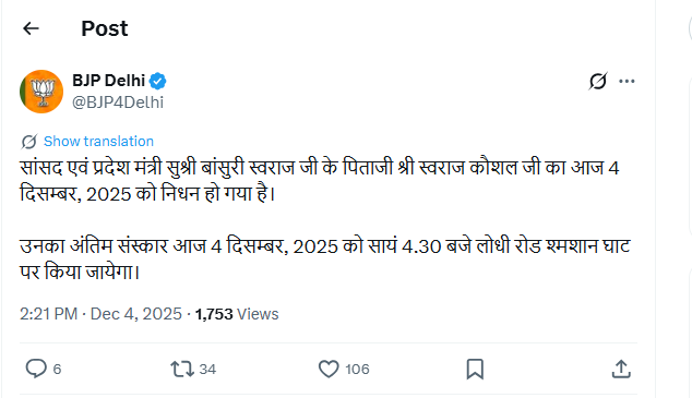 बीजेपी दिल्ली ने एक्स अकाउंट पर लिखा कि सांसद एवं प्रदेश मंत्री सुश्री बांसुरी स्वराज जी के पिताजी श्री स्वराज कौशल जी का आज 4 दिसम्बर, 2025 को निधन हो गया है। उनका अंतिम संस्कार आज 4 दिसम्बर, 2025 को सायं 4.30 बजे लोधी रोड श्मशान घाट पर किया जायेगा।