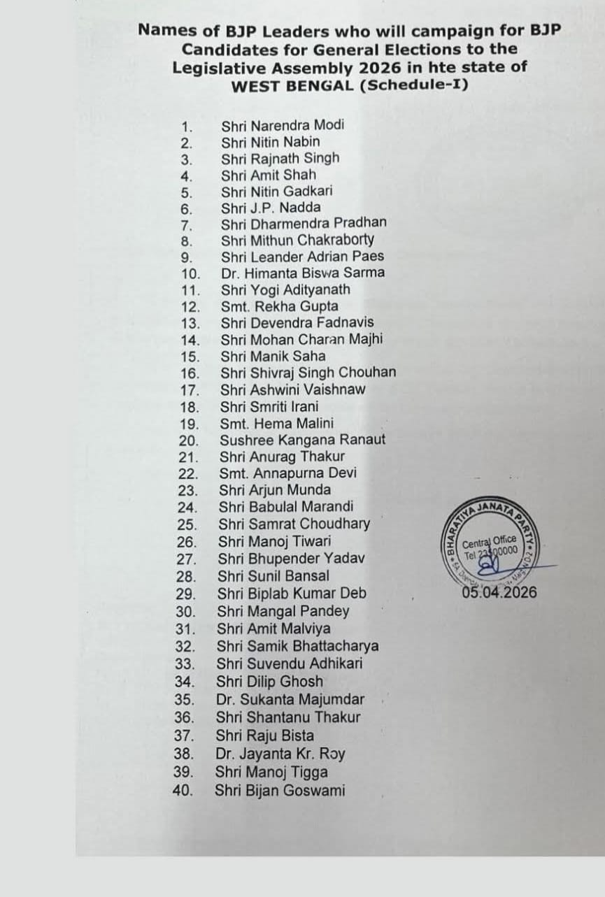 DESK: पश्चिम बंगाल में होने वाले विधानसभा चुनाव 2026 को लेकर राजनीतिक गतिविधियां तेज हो गई हैं। सभी प्रमुख दल चुनाव प्रचार में पूरी ताकत झोंक रहे हैं। इसी क्रम में भारतीय जनता पार्टी (BJP) ने अपने 40 स्टार प्रचारकों की सूची जारी की है, ताकि चुनाव अभियान को और मजबूत बनाया जा सके। इस सूची में प्रधानमंत्री नरेंद्र मोदी, BJP के राष्ट्रीय अध्यक्ष नितिन नबीन, केंद्रीय मंत्री और विभिन्न राज्यों के मुख्यमंत्री समेत कई दिग्गज नेताओं के नाम शामिल हैं। प्रमुख नेताओं में राजनाथ सिंह, अमित शाह, नितिन गडकरी, जेपी नड्डा, धर्मेंद्र प्रधान, शिवराज सिंह चौहान और अश्विनी वैष्णव शामिल हैं। इसके अलावा फिल्म जगत और अन्य क्षेत्रों से जुड़े चर्चित चेहरों को भी प्रचार अभियान में उतारा गया है। इनमें मिथुन चक्रवर्ती, स्मृति ईरानी, हेमा मालिनी, कंगना रनौत, मनोज तिवारी और लियेंडर पेस जैसे नाम शामिल हैं। पार्टी ने कई राज्यों के वरिष्ठ नेताओं को भी इस सूची में जगह दी है, जिनमें हिमंता बिस्वा सरमा, योगी आदित्यनाथ, देवेंद्र फडणवीस, माणिक साहा, अनुराग ठाकुर, अर्जुन मुंडा और बाबूलाल मरांडी प्रमुख हैं। इसके साथ ही सम्राट चौधरी, सुवेंदु अधिकारी, दिलीप घोष और डॉ. सुकांत मजूमदार जैसे नेता भी चुनाव प्रचार में सक्रिय रहेंगे। भाजपा ने पश्चिम बंगाल की 292 विधानसभा सीटों के लिए अपने उम्मीदवारों की घोषणा भी कर दी है। अलग-अलग चरणों में कुल उम्मीदवारों के नाम घोषित किए गए हैं। चुनाव आयोग के कार्यक्रम के अनुसार, राज्य में दो चरणों में मतदान होगा। पहले चरण के तहत 23 अप्रैल और दूसरे चरण में 29 अप्रैल को वोट डाले जाएंगे, जबकि मतगणना 4 मई को होगी। चुनाव को लेकर सभी दलों ने अपनी तैयारियां तेज कर दी हैं।