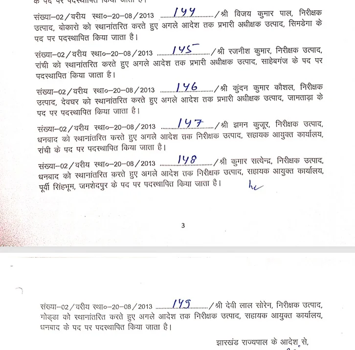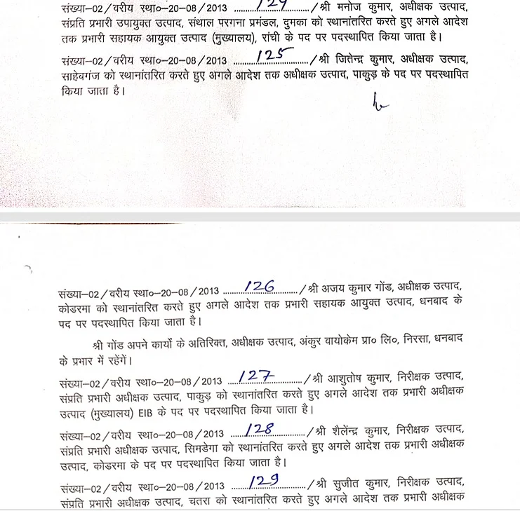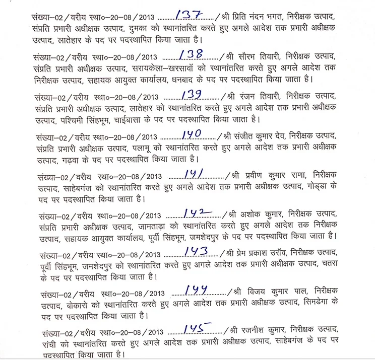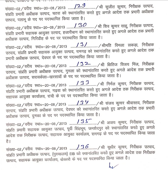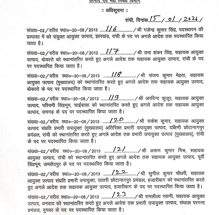 Transfer Posting: प्रशासनिक महकमे से इस वक्त की बड़ी खबर निकलकर सामने आ रही है। झारखंड में मद्य एवं उत्पाद विभाग में बड़े पैमाने पर तबादला किया गया है। सरकार ने तबादले की अधिसूचना जारी कर दी है। गजेंद्र कुमार सिंह और उमाशंकर सिंग को सहायक उत्पाद आयुक्त के पद पर तैनात किया गया है। पूरी लिस्ट देखिए..
