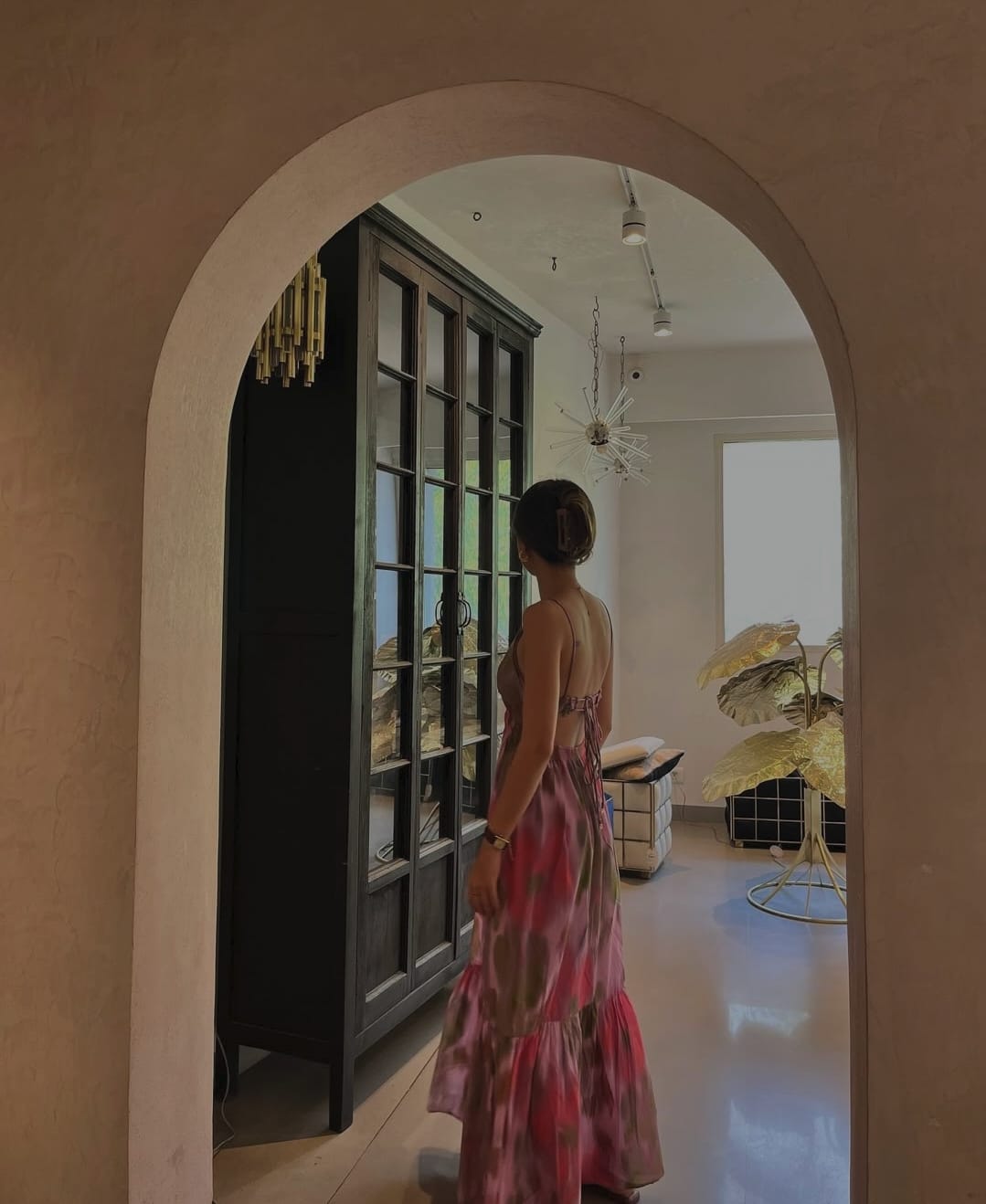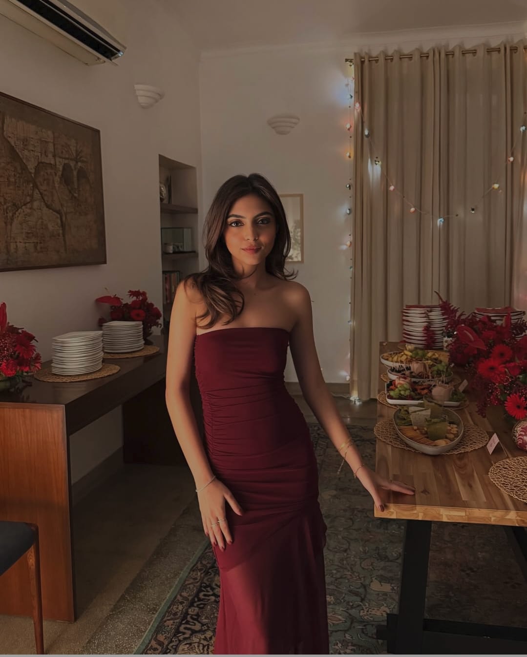 इसमें अवीवा बेग ने एलिगेंट स्ट्रैपलेस बॉडी-हगिंग मैक्सी ड्रेस पहन रखी है. इसका डीप वाइन/मरून रंग इसे क्लासी और ग्लैमरस लुक देता है. ड्रेस का फिट स्लिम सिलुएट को उभारता है और सॉफ्ट फैब्रिक इसे कंफर्ट बनाता है. यह ड्रेस कॉकटेल पार्टी, डिनर डेट या इवनिंग इवेंट के लिए बिल्कुल परफेक्ट है. मिनिमल ज्वेलरी के साथ अवीवा का लुक और निखरता है