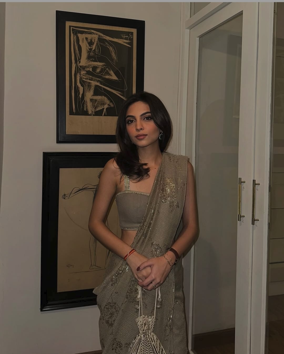 यह एक एलिगेंट और क्लासी साड़ी लुक है. इस ड्रेस में अवीवा ने हल्के गोल्डन कलर की कढ़ाईदार साड़ी पहनी हैं जिसमें बारीक और सॉफ्ट वर्क है. इसके साथ स्लीवलेस, मैचिंग ब्लाउज़ साड़ी के साथ ग्रेसफुल लगता है. इसमें अवीवा ने सादा लेकिन रिच लुक दी है जो साड़ी की डिटेलिंग को उभारता है. यह आउटफिट पार्टी, फेस्टिव या इवनिंग फंक्शन के लिए बेहद सॉफिस्टिकेटेड और रिफाइंड दिखाई देता है.