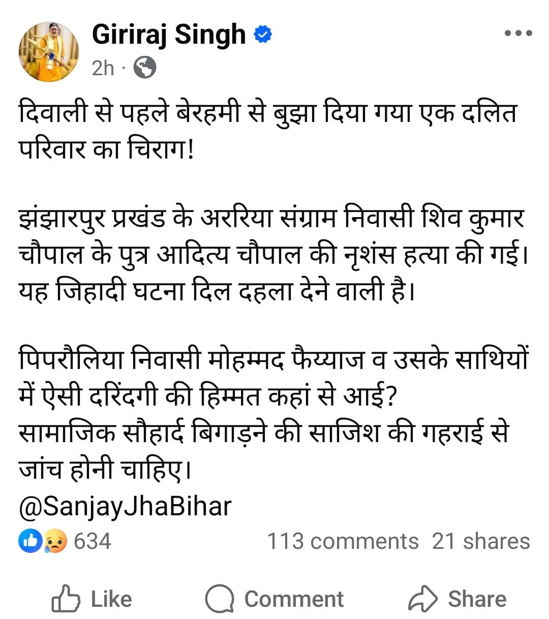 गिरिराज सिंह ने अपनी पोस्ट में लिखा.. “दिवाली से पहले बेरहमी से बुझा दिया गया एक दलित परिवार का चिराग! झंझारपुर प्रखंड के अररिया संग्राम निवासी शिव कुमार चौपाल के पुत्र आदित्य चौपाल की नृशंस हत्या की गई। यह जिहादी घटना दिल दहला देने वाली है। पिपरौलिया निवासी मोहम्मद फैय्याज व उसके साथियों में ऐसी दरिंदगी की हिम्मत कहां से आई? सामाजिक सौहार्द बिगाड़ने की साजिश की गहराई से जांच होनी चाहिए।