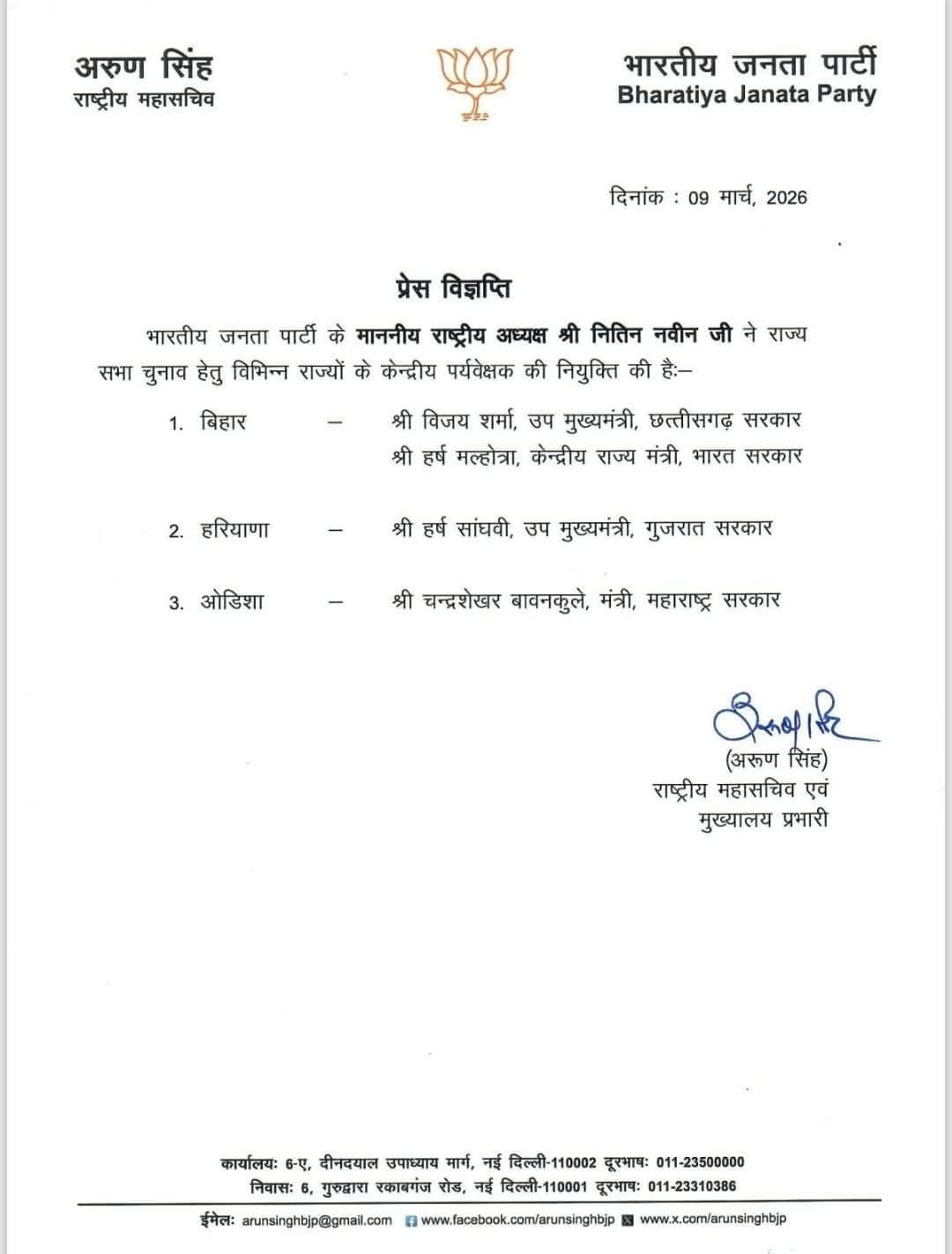 भारतीय जनता पार्टी के राष्ट्रीय महासचिव और मुख्यालय प्रभारी अरुण सिंह की तरफ से इसको लेकर प्रेस विज्ञप्ति जारी की गई है। जिसमें कहा गया है कि पार्टी के राष्ट्रीय अध्यक्ष नितिन नबीन ने राज्यसभा चुनाव को लेकर विभिन्न राज्यों के लिए केंद्रीय पर्यवेक्षक की नियुक्ति की है।