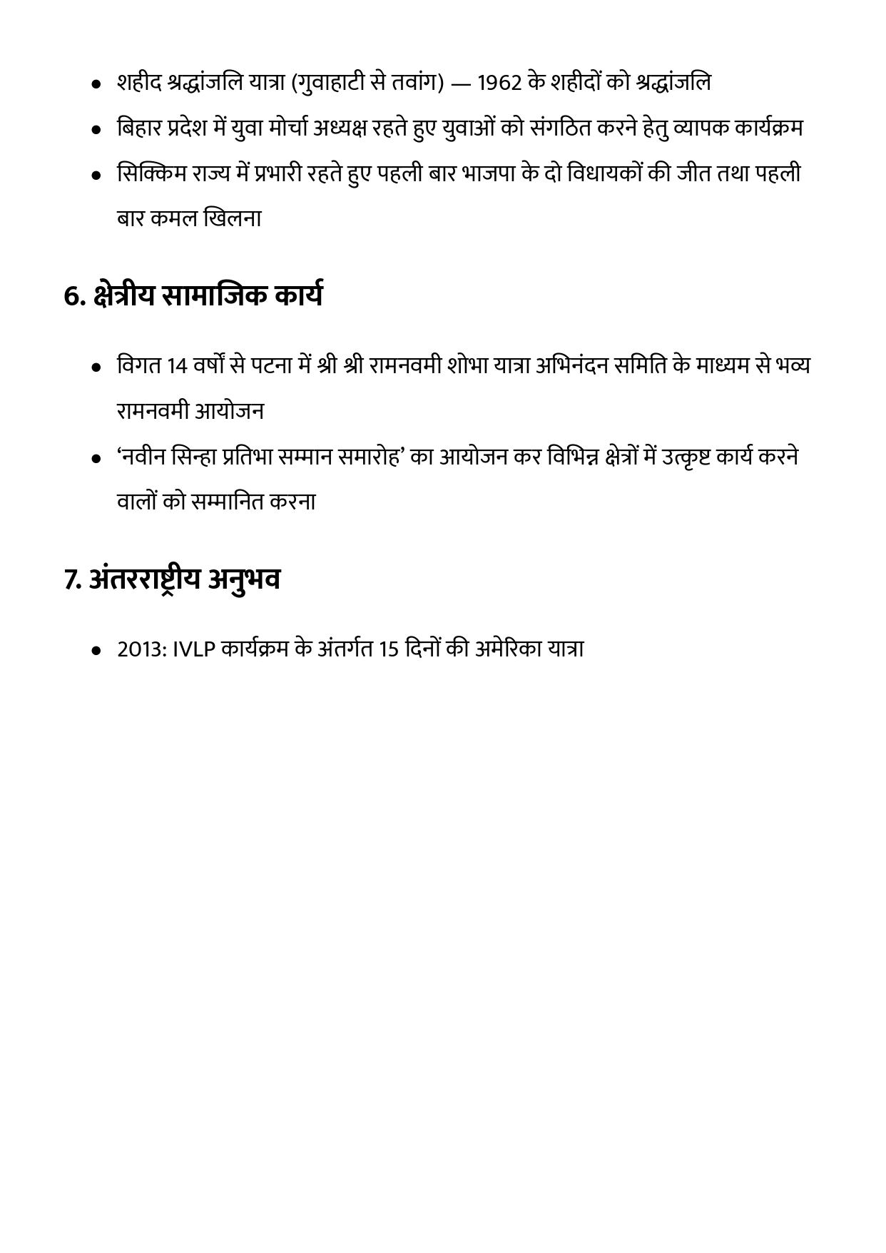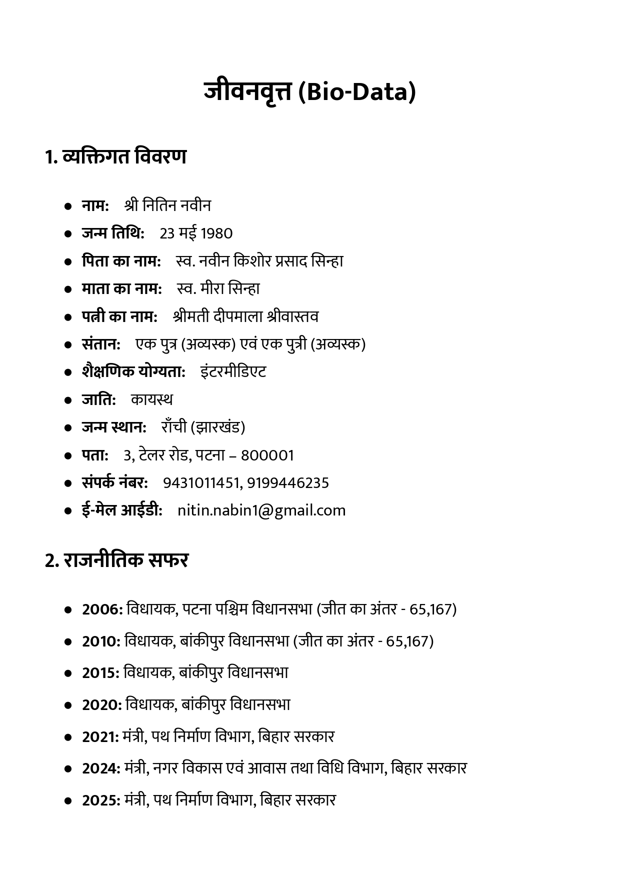 नितिन नवीन पटना की बांकीपुर विधानसभा सीट से लगातार चार बार विधायक रह चुके हैं। वर्तमान में वे नीतीश सरकार में पथ निर्माण तथा नगर विकास एवं आवास विभाग की जिम्मेदारी संभाल रहे हैं। राजनीति उन्हें विरासत में मिली है। उनके पिता नवीन किशोर सिन्हा बिहार भाजपा के कद्दावर नेताओं में गिने जाते थे। पिता के आकस्मिक निधन के बाद नितिन नवीन ने राजनीति में कदम रखा।