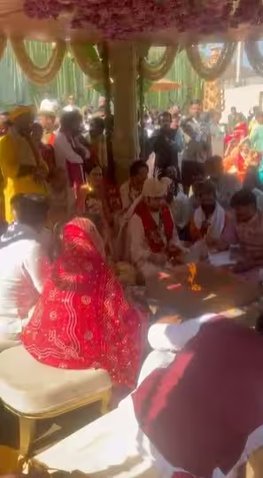 Indresh Upadhyay wedding: प्रसिद्ध कथावाचक इंद्रेश उपाध्याय जयपुर में विवाह बंधन में बंध गए। हल्दी, मेहंदी और संगीत की रस्मों के बाद अब उनकी शादी की पहली झलक सामने आ गई है, जो आते ही सोशल मीडिया पर तेजी से वायरल हो रही है। दूल्हा-दुल्हन की मंडप से साझा की गई तस्वीरों ने प्रशंसकों का दिल जीत लिया है।