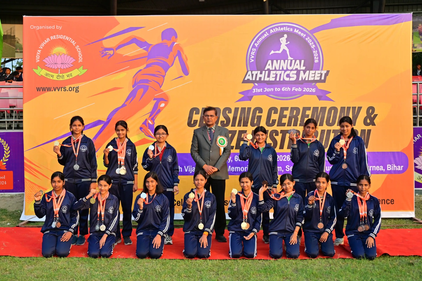 Purnea News: पूर्णिया के परोरा स्थित विद्या विहार आवासीय विद्यालय में सत्र 2025–26 के अंतर्गत आयोजित सात दिवसीय वार्षिक एथलेटिक्स मीट का भव्य समापन 6 फरवरी 2026 को रमेश विजयलक्ष्मी मेमोरियल स्टेडियम, सीनियर कैंपस में उत्साहपूर्ण माहौल के बीच सम्पन्न हुआ। 31 जनवरी से प्रारंभ हुए इस खेल महोत्सव ने पूरे सप्ताह विद्यालय परिसर को खेल ऊर्जा, प्रतिस्पर्धा और उत्साह से भर दिया। कार्यक्रम का उद्देश्य विद्यार्थियों में खेल प्रतिभा को निखारना, अनुशासन और नेतृत्व क्षमता विकसित करना तथा स्वस्थ प्रतिस्पर्धा की भावना को बढ़ावा देना रहा।