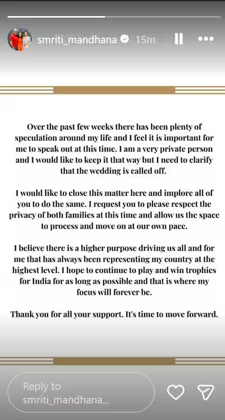 स्मृति ने आगे लिखा, "मैं इस मामले को यहीं खत्म करना चाहती हूं और आप सभी से भी ऐसा करने की रिक्वेस्ट करती हूं। इस समय दोनों परिवारों की प्राइवेसी का सम्मान करें और हमें आगे बढ़ने का मौका दें। मेरा मानना है कि हम सभी के पास एक बड़ा मकसद होता है और मेरे लिए वह हमेशा अपने देश को सबसे ऊंचे स्तर पर रिप्रेजेंट करना रहा है। मुझे उम्मीद है कि मैं जब तक हो सके भारत के लिए खेलती रहूं और ट्रॉफी जीतती रहूं। मेरा फोकस हमेशा वहीं रहेगा।"