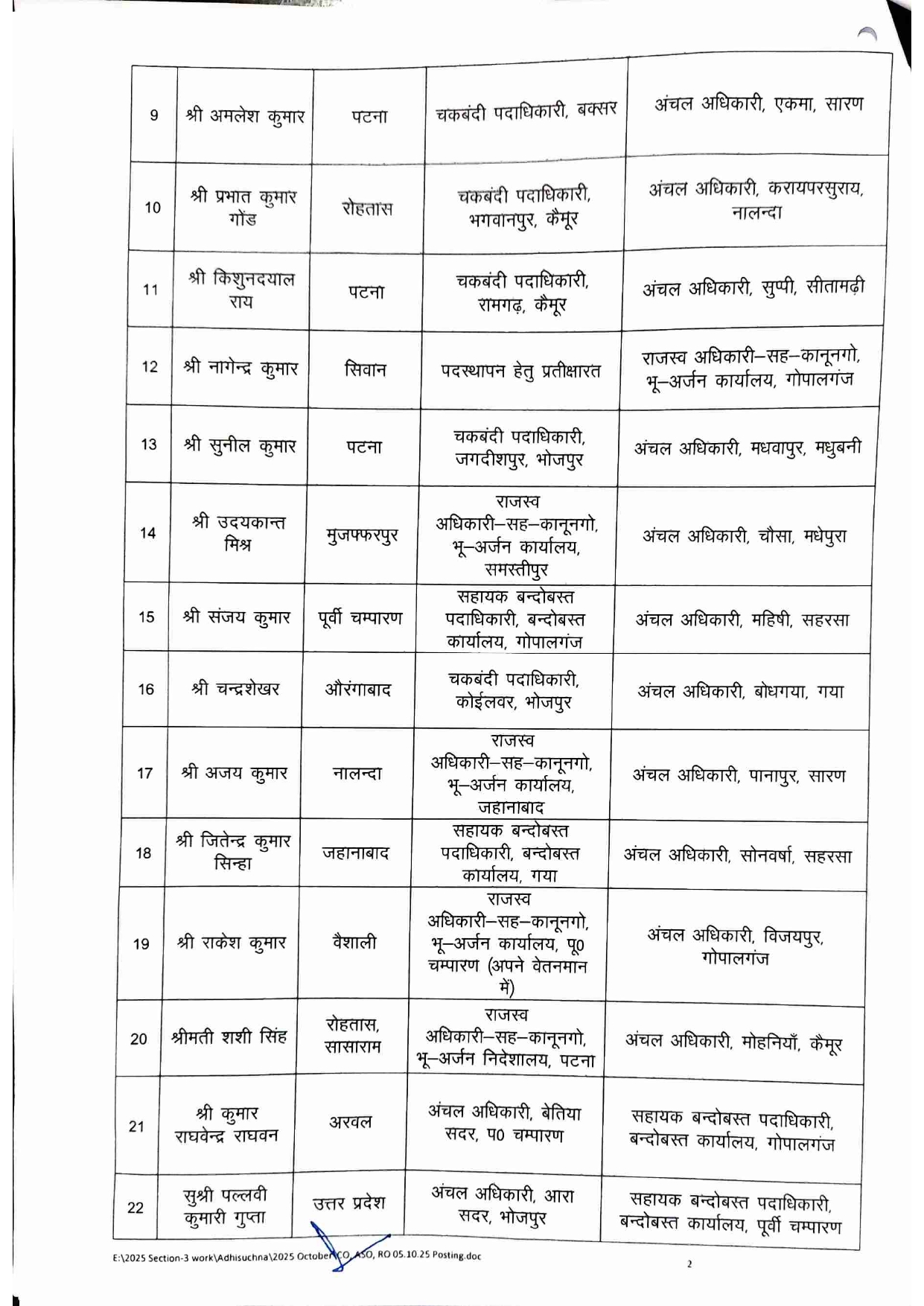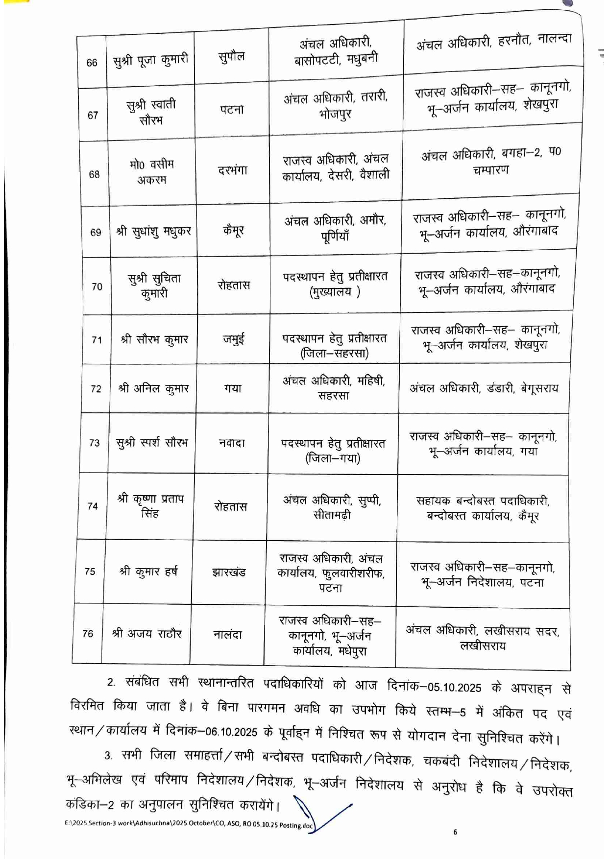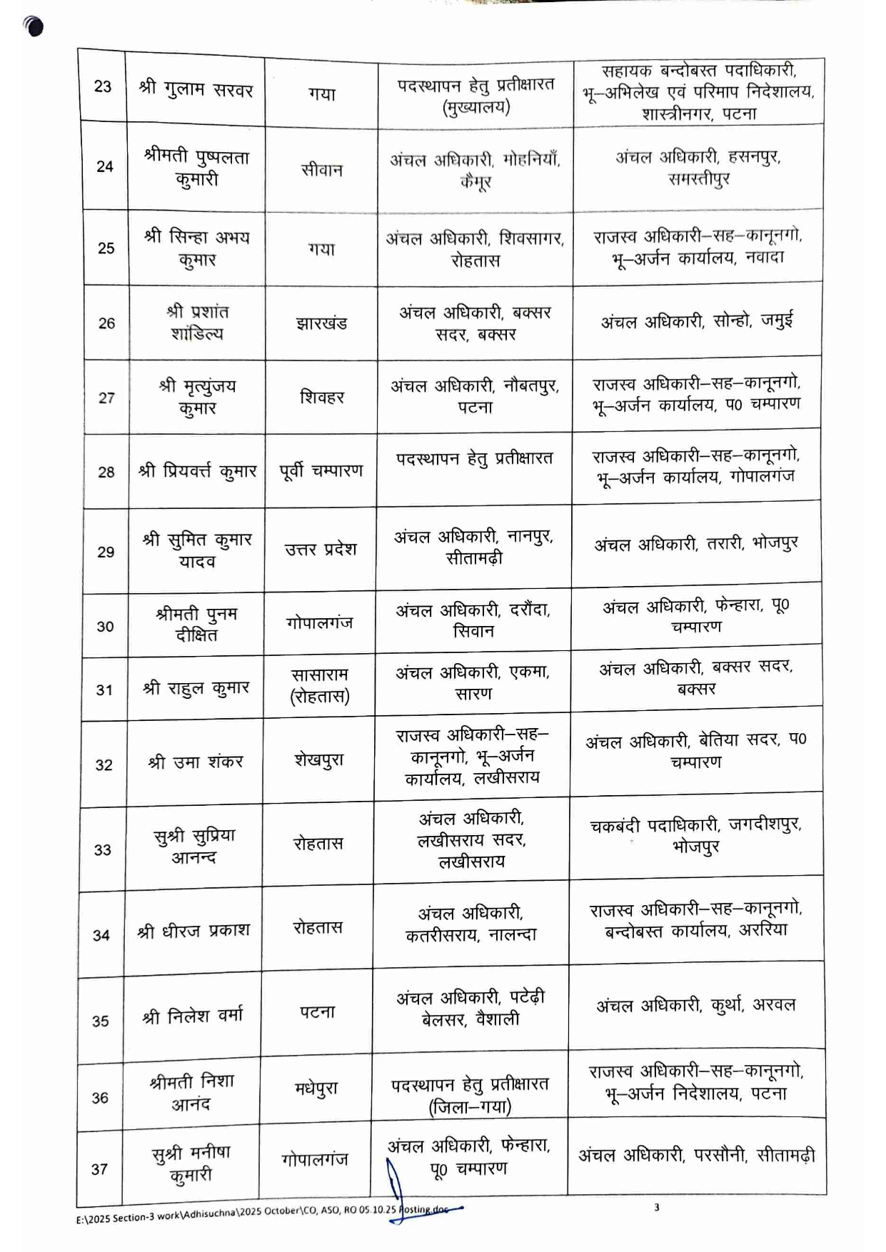 पश्चिम चंपारण के बेतिया सदर के अंचल अधिकारी कुमार राघवेन्द्र राघवन को गोपालगंज में सहायक बंदोबस्त पदाधिकारी, बंदोब्त कार्यालय भेजा गया है। ये अरवल के रहने वाले हैं। जबकि उत्तर प्रदेश की रहने वाली सुश्री पल्लवी कुमारी गुप्ता भोजपुर के आरा सदर की अंचल अधिकारी को पूर्वी चंपारण के बंदोबस्त कार्यालय में सहायक बंदोबस्त पदाधिकारी बनाया गया है। देखिये तबादले से जुड़ी पूरी लिस्ट...