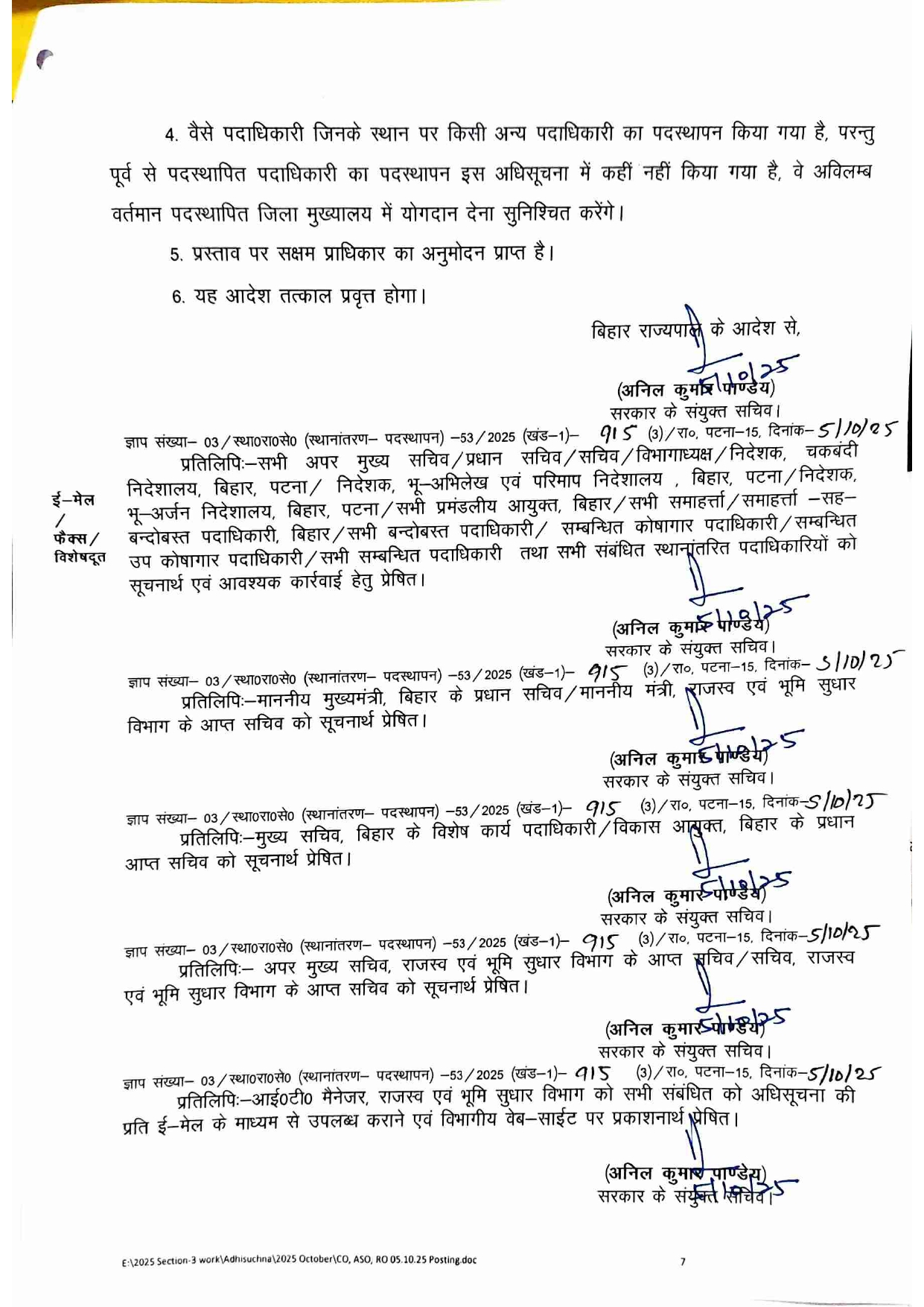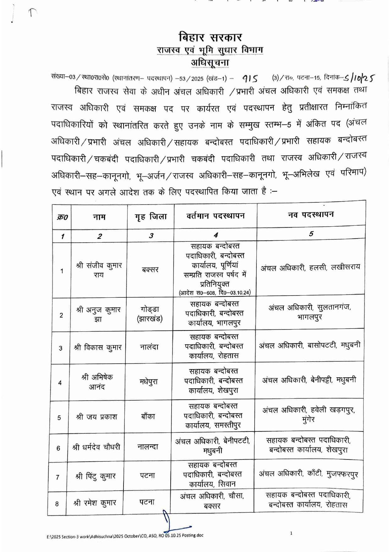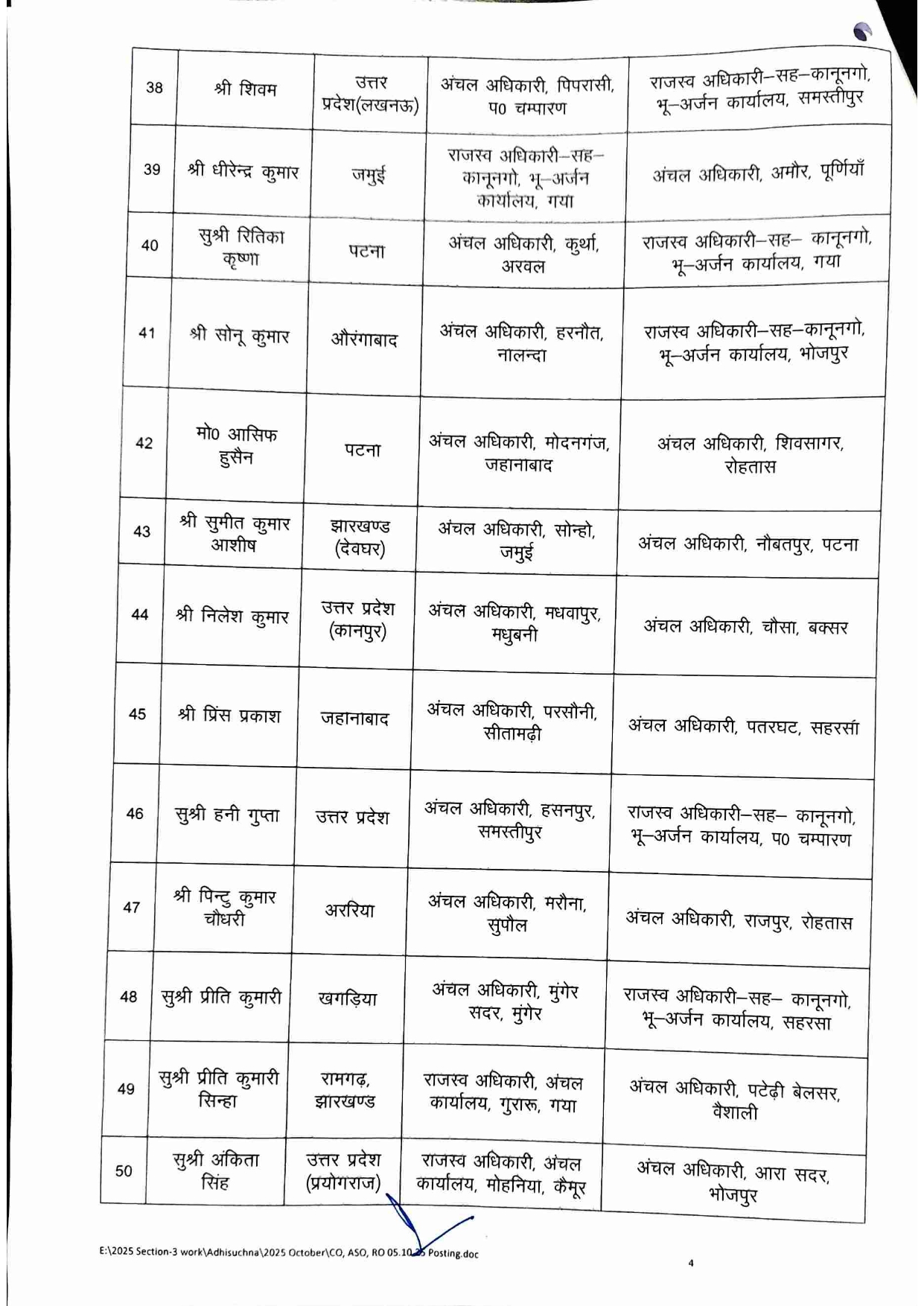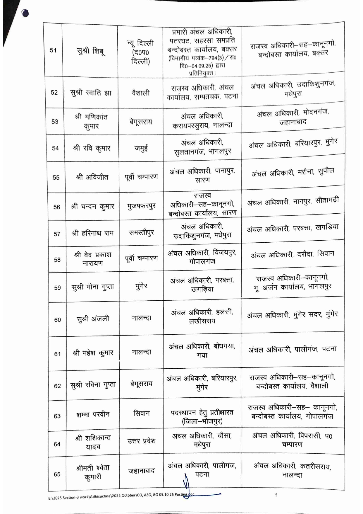पश्चिम चंपारण के बेतिया सदर के अंचल अधिकारी कुमार राघवेन्द्र राघवन को गोपालगंज में सहायक बंदोबस्त पदाधिकारी, बंदोब्त कार्यालय भेजा गया है। ये अरवल के रहने वाले हैं। जबकि उत्तर प्रदेश की रहने वाली सुश्री पल्लवी कुमारी गुप्ता भोजपुर के आरा सदर की अंचल अधिकारी को पूर्वी चंपारण के बंदोबस्त कार्यालय में सहायक बंदोबस्त पदाधिकारी बनाया गया है। देखिये तबादले से जुड़ी पूरी लिस्ट...