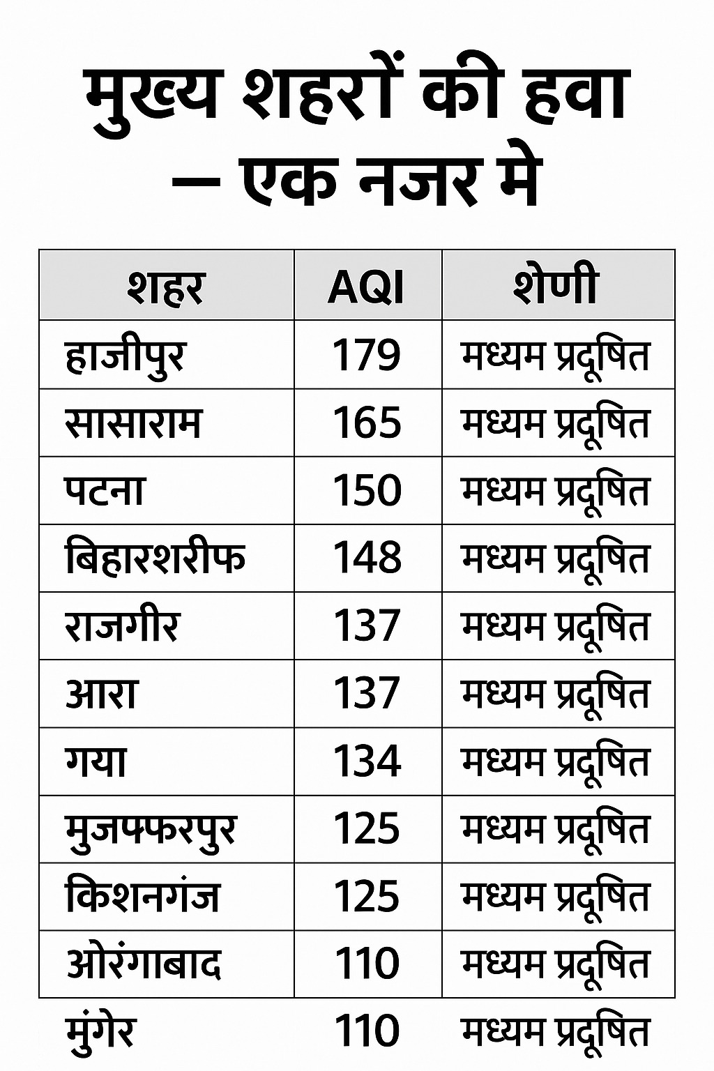 बिहार के कई प्रमुख शहरों की हवा भी संतोषजनक से मध्यम प्रदूषित श्रेणी के बीच रही। कटिहार (AQI 96), छपरा (67), बेतिया (90), भागलपुर (94), मोतिहारी (84) और सहरसा (83) की हवा संतोषजनक श्रेणी में दर्ज की गई।