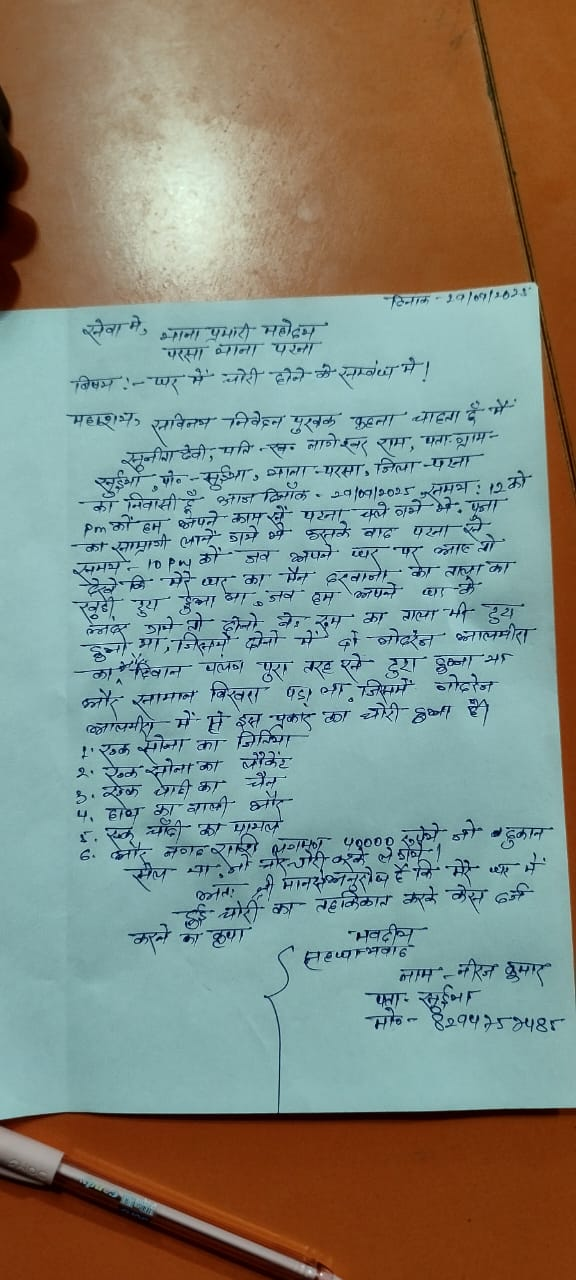 पीड़िता द्वारा परसा पुलिस को दिये गये आवेदन में इस बात का जिक्र है कि घटना 29 सितंबर 2025 की है। दोपहर 12 बजे सुनीता देवी अपने पुत्र नीरज कुमार के साथ पूजा का सामान खरीदने के लिए पटना गई हुई थी। जब रात में करीब 10 बजे वह सुईथा स्थित अपने आवास पर पहुंची तब देखा की घर का मेन दरवाजे का ताला टूटा पड़ा है। वो जब घर के अंदर गई तो रूम के गेट का ताला भी टूटा हुआ है। वही दोनों कमरों में रखे गोडरेज का आलमीरा का लॉक भी टूटा हुआ है जबकि दीवान पलंग के अंदर का सामान भी बाहर बिखरा पड़ा है।