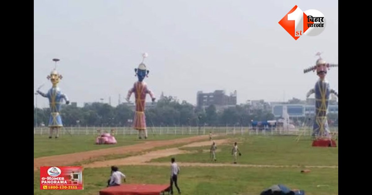 PATNA: पटना के गांधी मैदान में दशहरा महोत्सव की तैयारियां अंतिम चरण में हैं। इस बार 80 फीट ऊंचे रावण का दहन किया जाएगा, जबकि मेघनाद 75 फीट और कुंभकरण 70 फीट ऊंचे पुतलों के रूप में तैयार हो रहे हैं। बारिश की संभावना को देखते हुए इन पुतलों पर क्लियर वार्निश लगाया गया है, ताकि पानी का असर न हो।