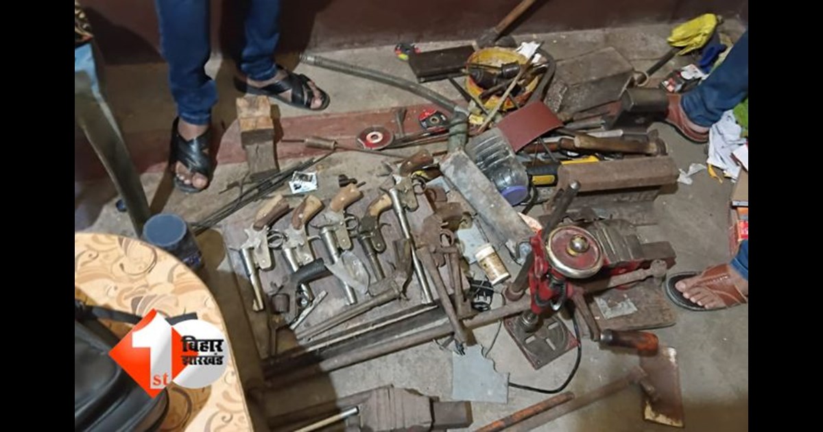 छापेमारी के दौरान पुलिस ने 07 देसी कट्टा, 01 सिक्सर रिवॉल्वर, 02 जिंदा कारतूस, 01 राइफल बोल्ट, 02 बैरल, ड्रिल मशीन, बेस मशीन, ग्राइंडर मशीन, हैंड बेस मशीन, राइफल की लकड़ी का बट, रेलवे पटरी के टुकड़े, अर्धनिर्मित हथियार, स्प्रिंग,क्सा, रेती, बैरल निर्माण पाइप और स्टील की चादरें बरामद की है। पुलिस ने सभी सामग्रियों को जब्त कर विधिसम्मत कार्रवाई शुरू कर दी है।