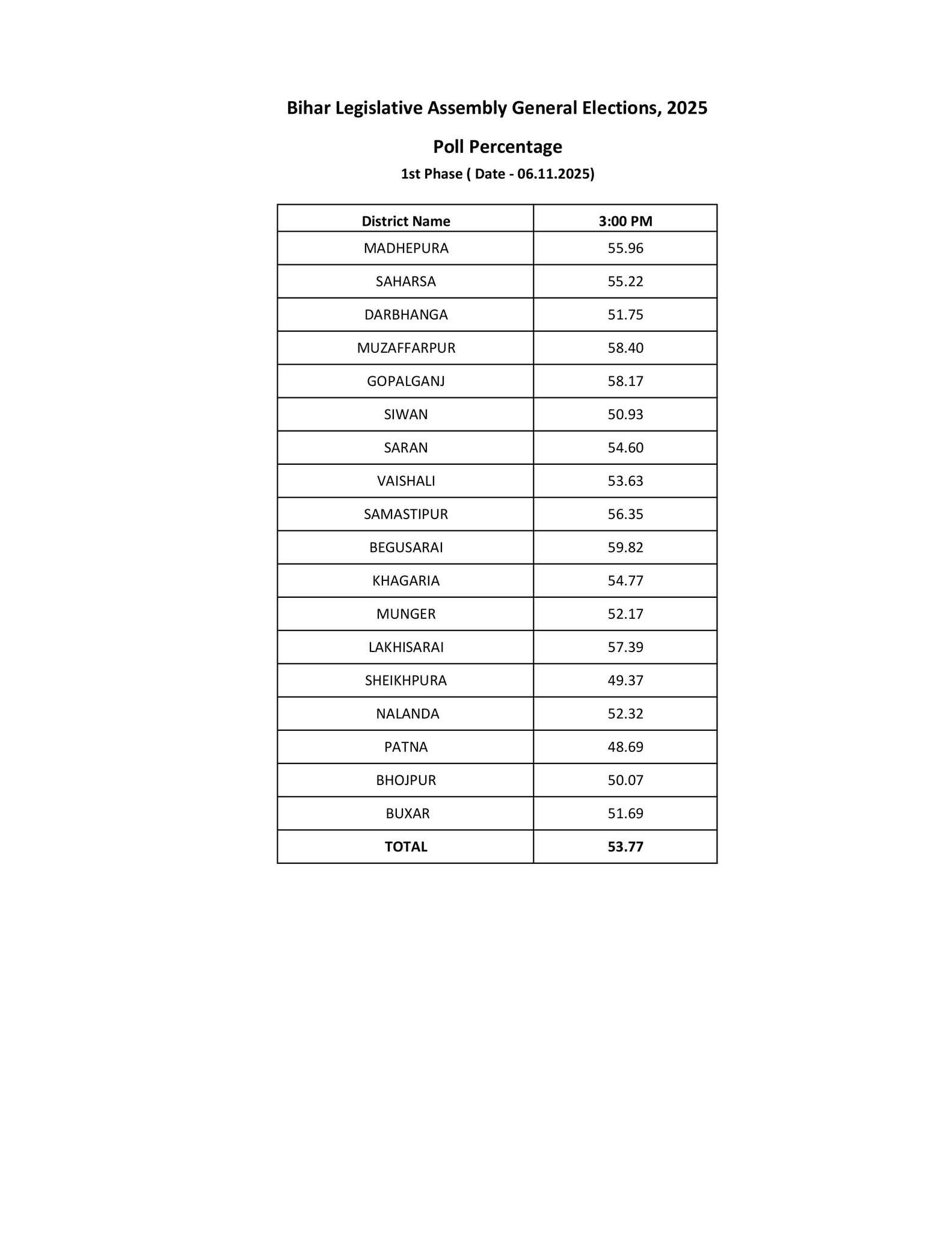 Bihar Election 2025: बिहार विधानसभा चुनाव के पहले चरण में आज राज्य के 18 जिलों में सुबह 7 बजे से वोटिंग जारी है। पहले चरण में बिहार के कुल 121 विधानसभा सीटों के लिए वोटिंग कराई जा रही है। चुनाव आयोग की तरफ से दोपहर 3 बजे तक का वोटिंग प्रतिशत जारी किया गया है। दोपहर एक बजे औसत कुल 53.77 प्रतिशत वोटिंग हुई है।