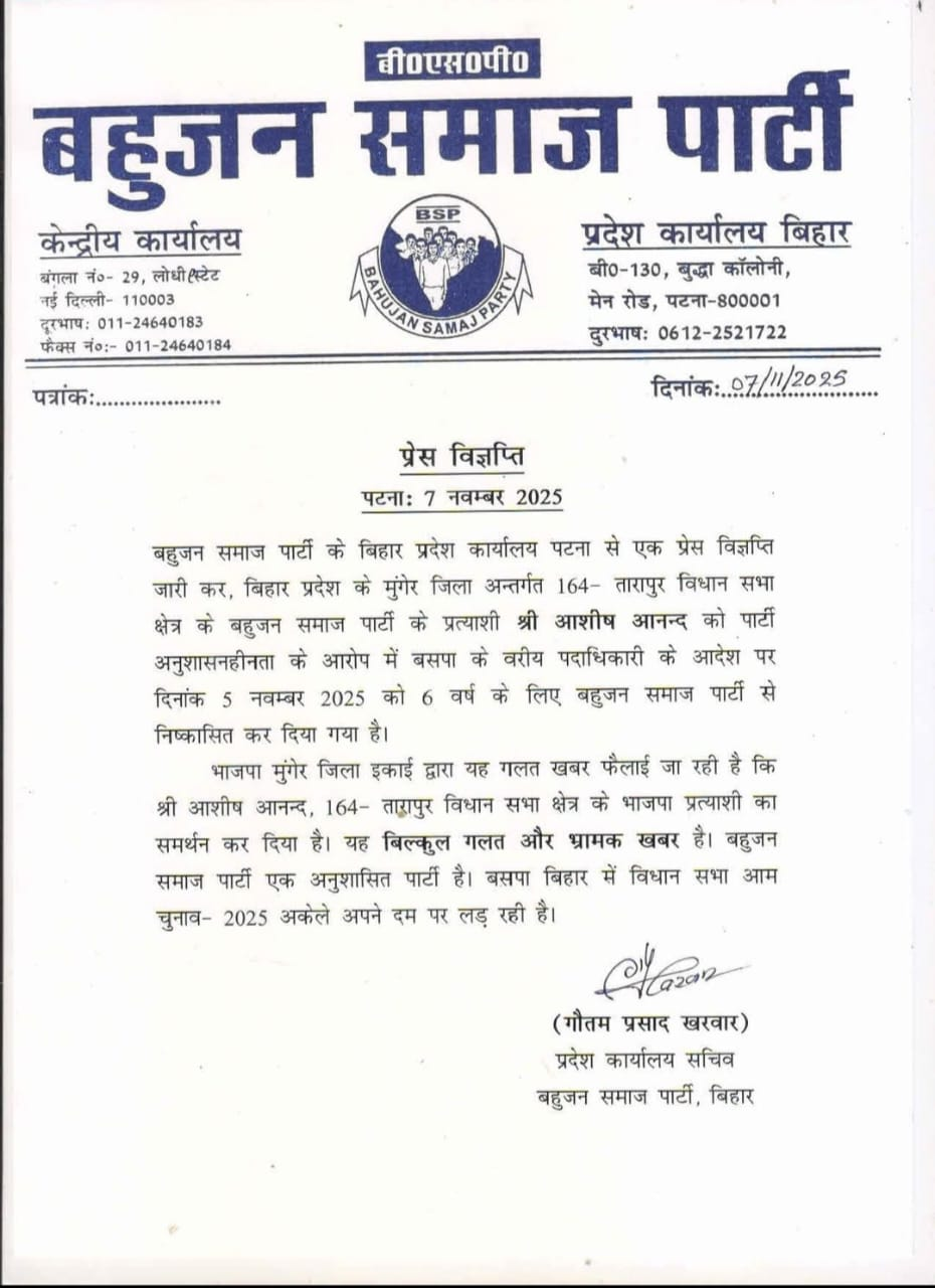 दरअसल, कुछ दिन पहले तारापुर से बसपा उम्मीदवार आशीष आनंद ने सार्वजनिक रूप से बीजेपी प्रत्याशी सम्राट चौधरी का समर्थन किया था। बसपा नेतृत्व ने इसे पार्टी अनुशासन और विचारधारा के खिलाफ कदम बताया।